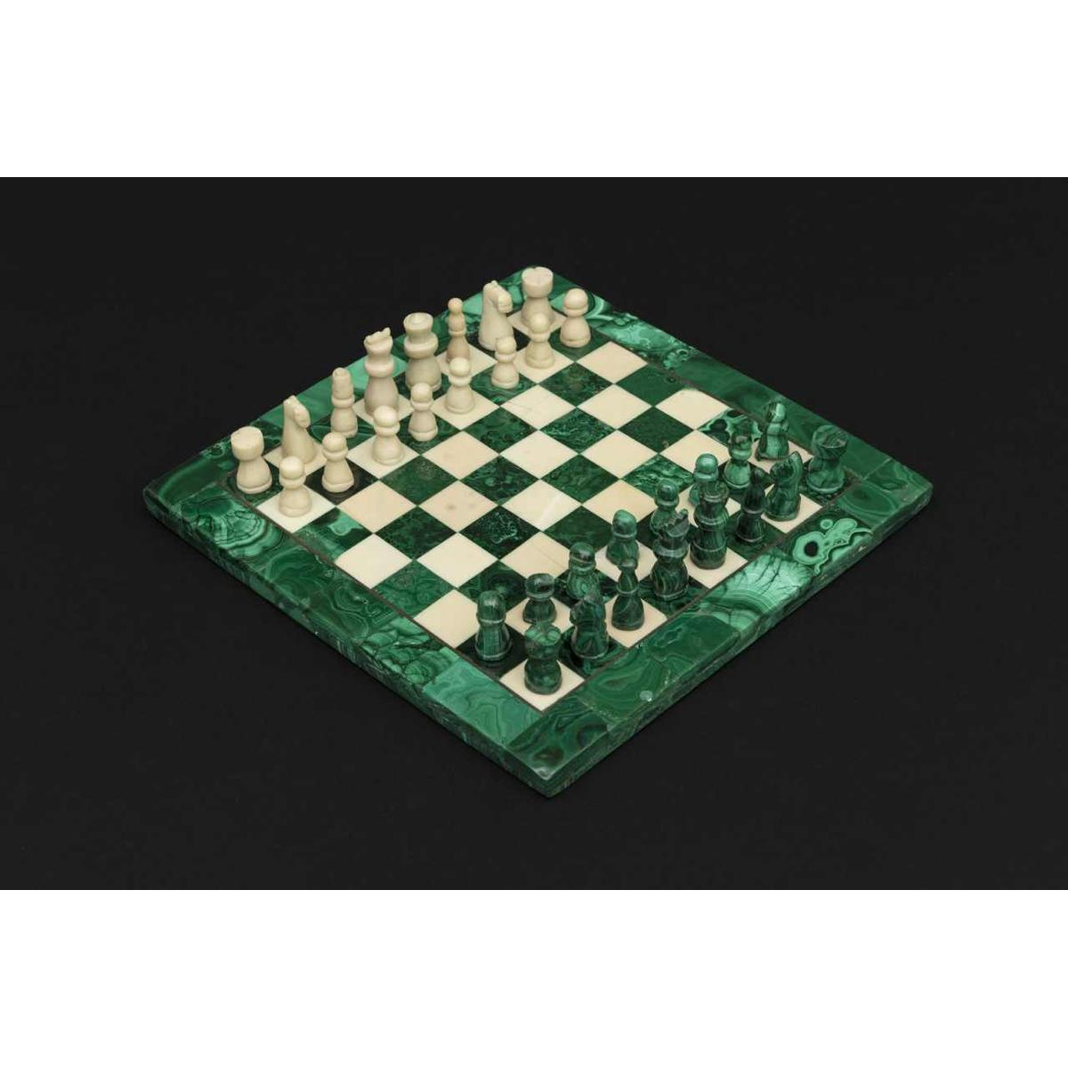 The chessboard is square-shaped with a thin malachite border inlaid with brass fillets around both the board and the chess pieces made of malachite and Carrara marble. Add this lovely set to your collection.