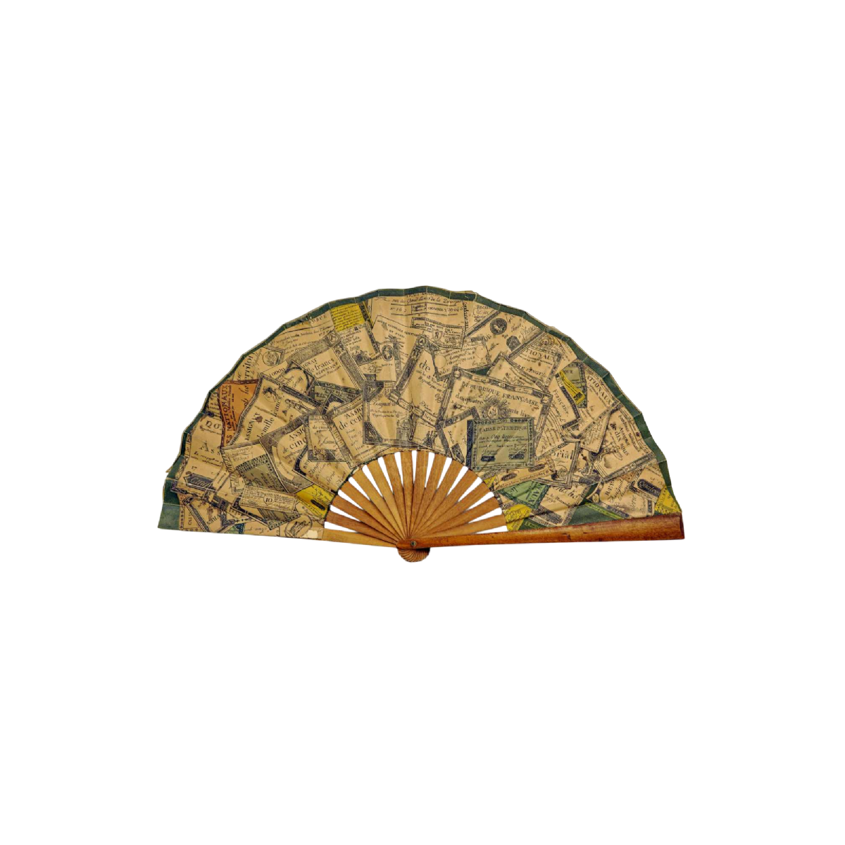 Folded fan, double paper sheet, engraved with a trompe-l'œil jumble of assignats, evoking the assignat fans produced during the French Revolution. On the right, "Herold et Cie imprimeur" and "E. Fauco (?)" for the fan maker Faucon. Dull reverse. Partially erased stamp on reverse " (...) Paris".