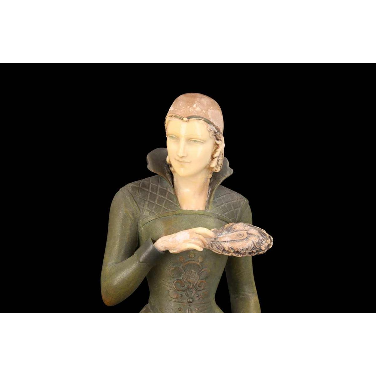 Her face, sculpted in ivoirine or ivory paste, contrasts with the green and gold patina of her dress and the animals.
