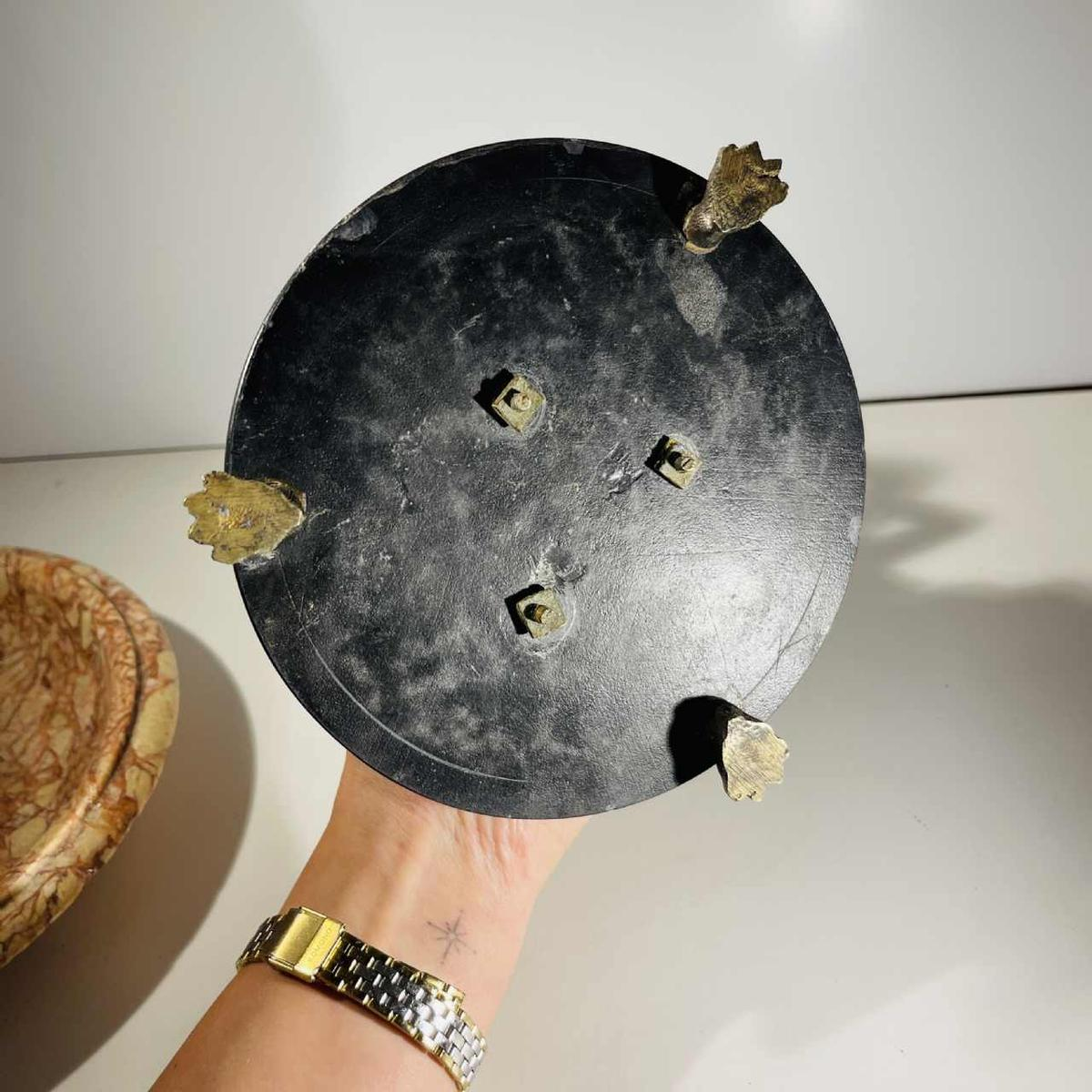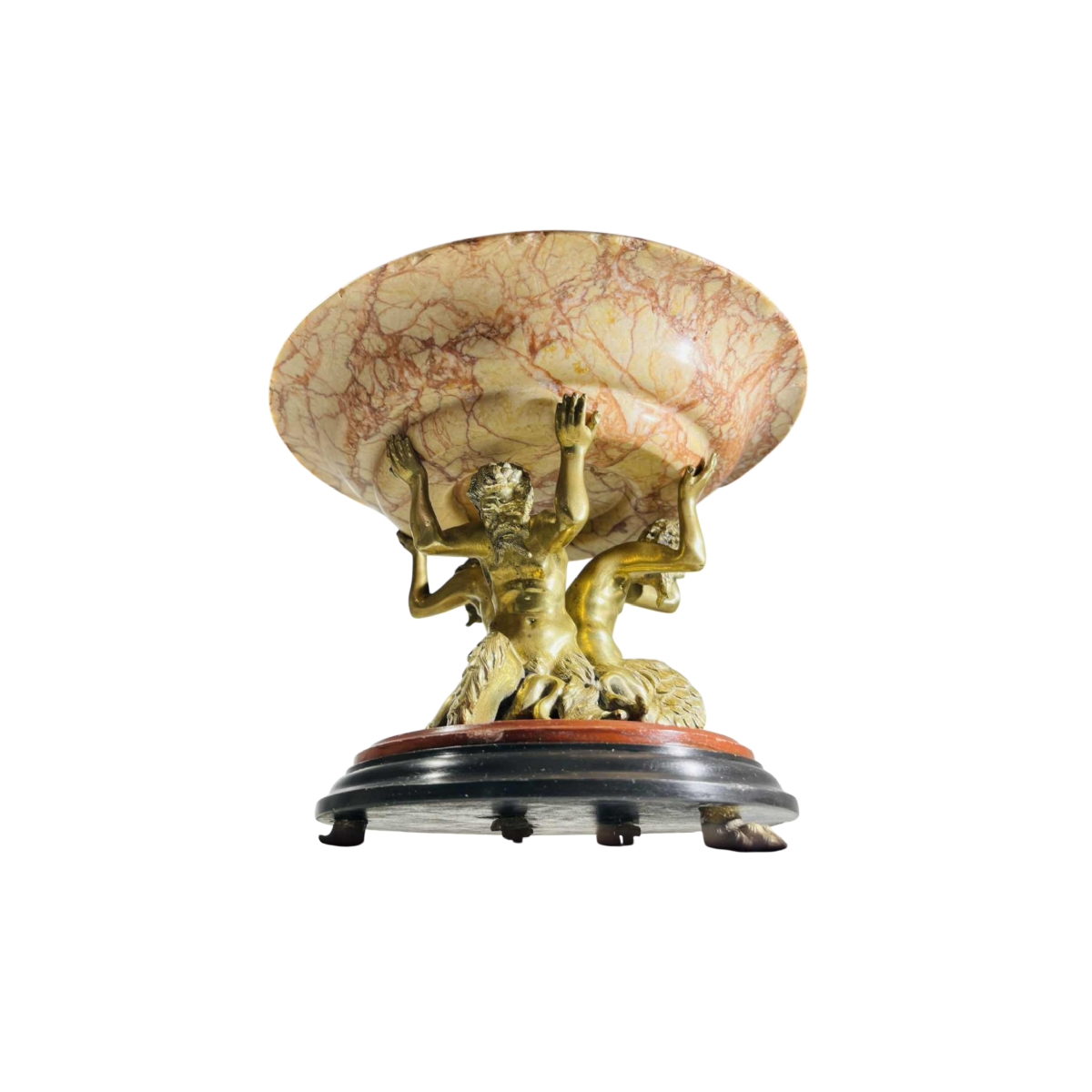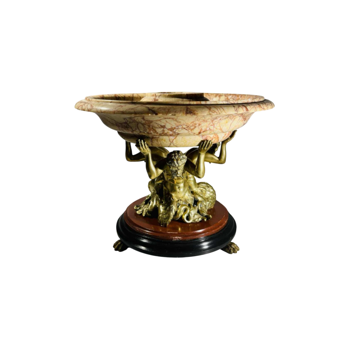 This sculptural bowl from the 19th century embodies the refinement and symbolism of Antiquity. Three gilded bronze tritons, powerful half-man half-fish figures from marine mythology, support a veined Tuscan marble bowl in a solemn, sculptural gesture. Their dynamic, expressive posture, combined with the precision of the chasing, gives the piece a dramatic, almost architectural feel. The tritons rest on a round base in multiple marbles (Mazy black, veined red) supported by three bronze ‘animal claw' feet.