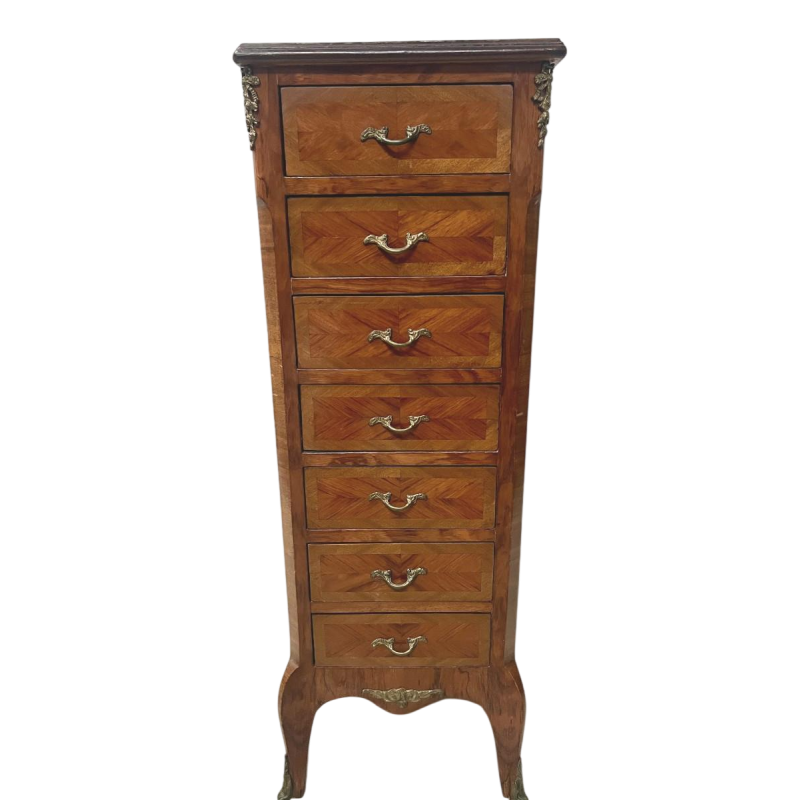 Louis XV style rosewood veneer chest of drawers. Seven drawers with bronze handles on the front. The top is a wooden slab. Good condition. Dimensions: H 123 x W 42 x D 39 cm. 20th century. More photos available upon request.