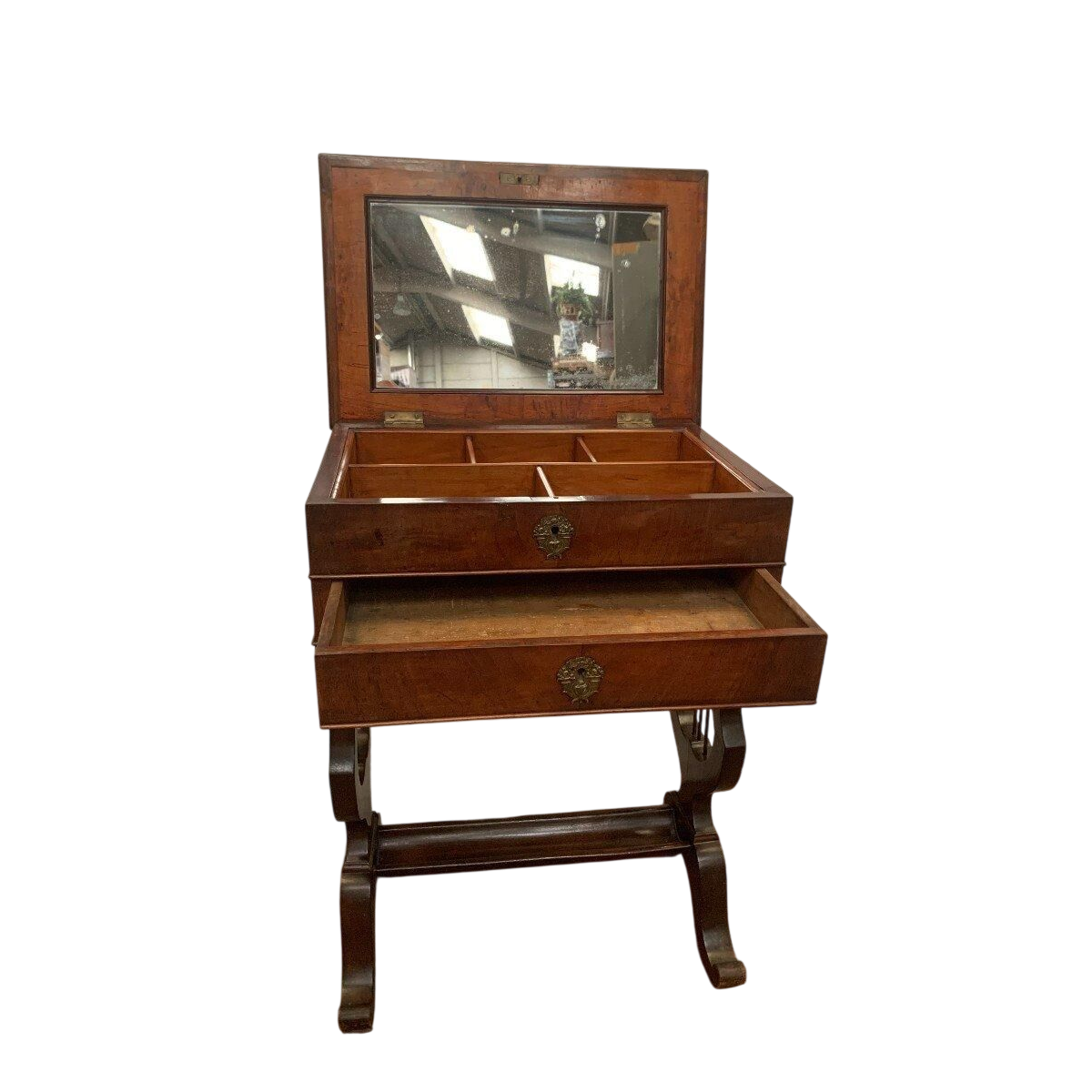 A drawer in the belt and an interior shelf with a mirrored bottom.