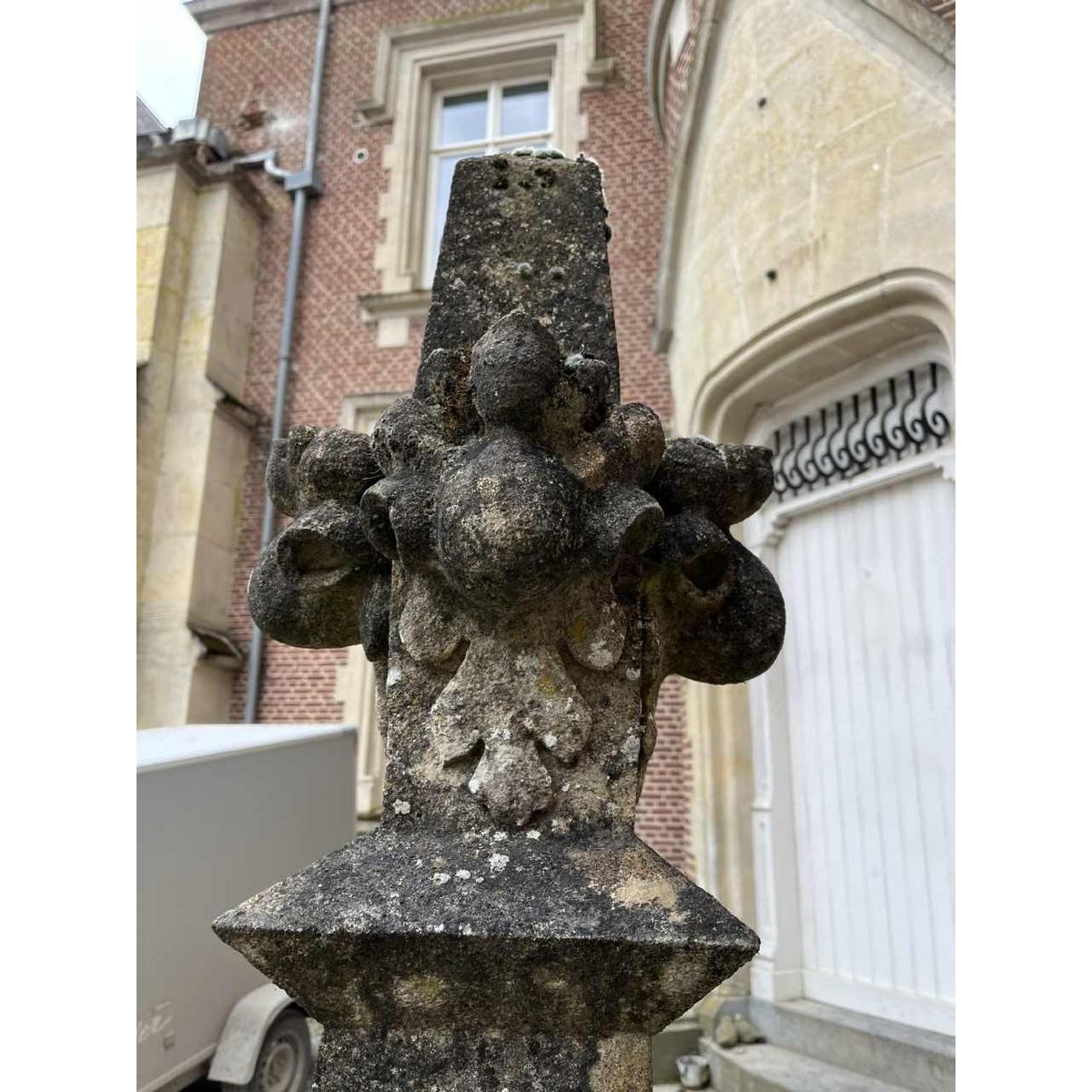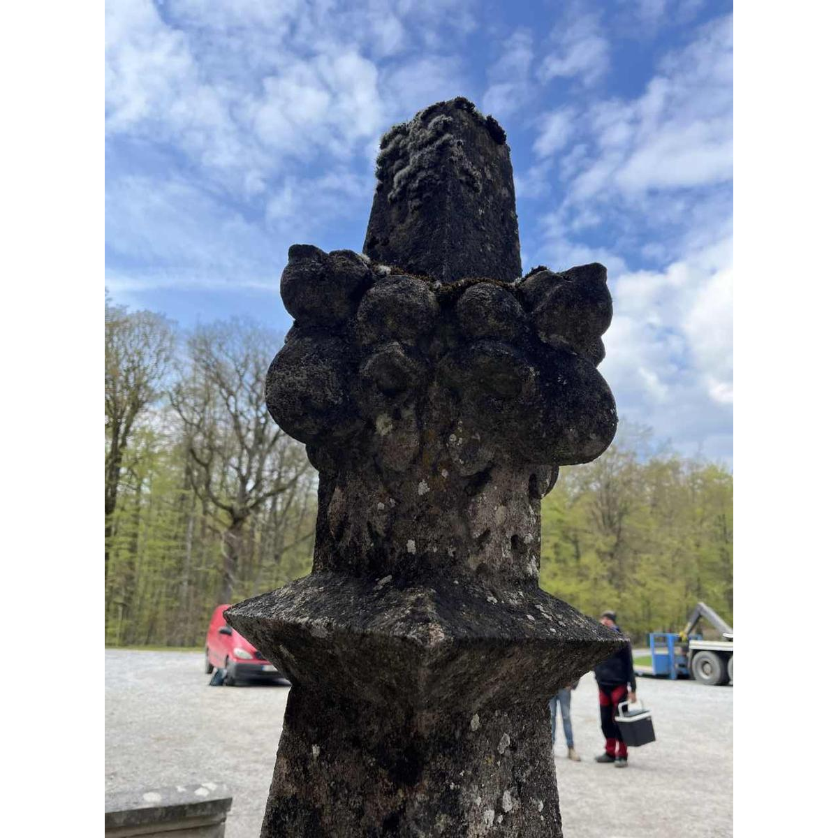 Composed of three elements carved on 4 sides for 9 pieces and one carved on 3 sides, they are all crowned with a magnificent bouquet of 4 fleur-de-lys resting on a 4-sided obelisk.
