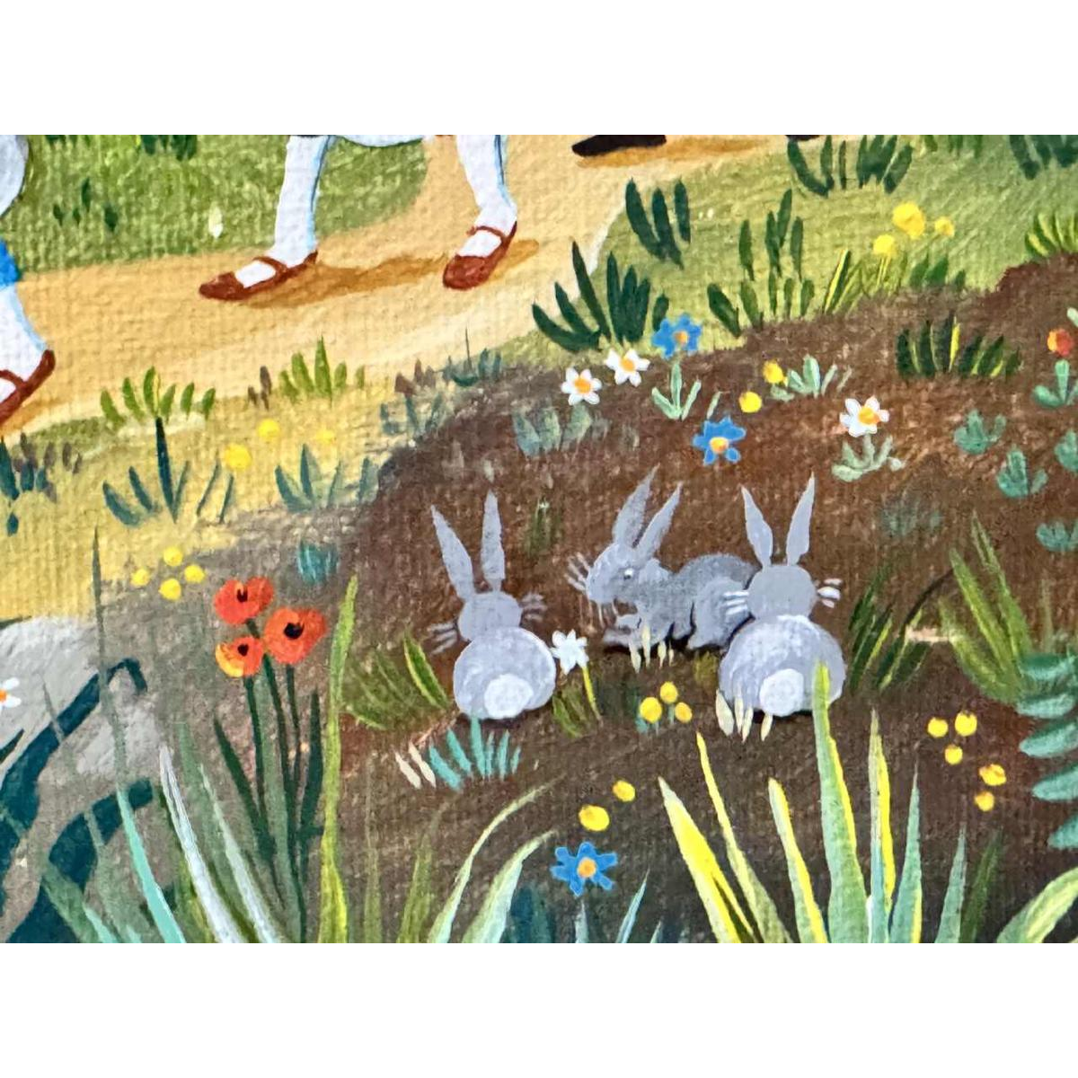 A painter born in Brussels in 1943, she studied plastic arts. She taught drawing for a year, then she went to Argentina where she will live for four years of various sculpture and crafts. After her return to Belgium, she went headlong into the painting of joyful, naive and colourful paintings that brought her immediate success. Ref : femmespeintres.be. Is listed at the Musée d'Art Naïf in Paris