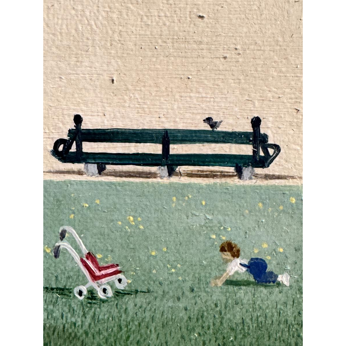 Beautiful naive art painting depicting scenes of daily life in a Brussels park: children playing, a person walking… . Painting from the early 1970s (the frame was made by the Schleiper company in 1972).