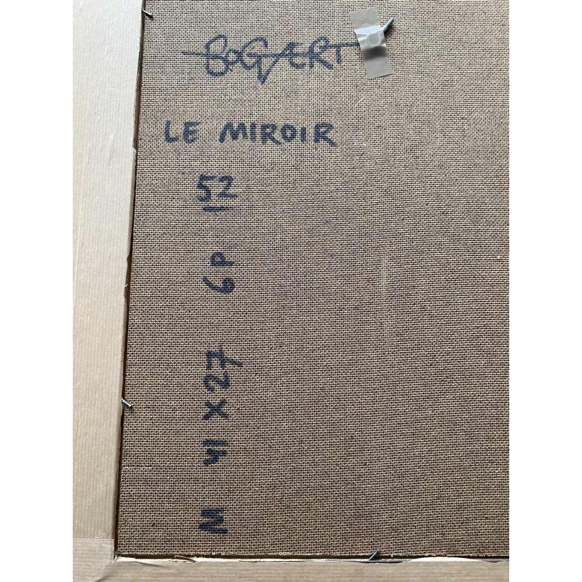 Oil on panel depicting a beautiful mirror in a space that seems abandoned and already a little overgrown. A painting entirely in the surrealist style favored by the painter Gaston Bogaert (Le Mans, 1918 - Etterbeek, 2008). Signed on the front and countersigned on the back, with title and dimensions. In its original wooden frame, chosen by the painter himself and matching the colors of the painting. Dimensions: 41 x 27 , with frame: 57 x 43 cm.