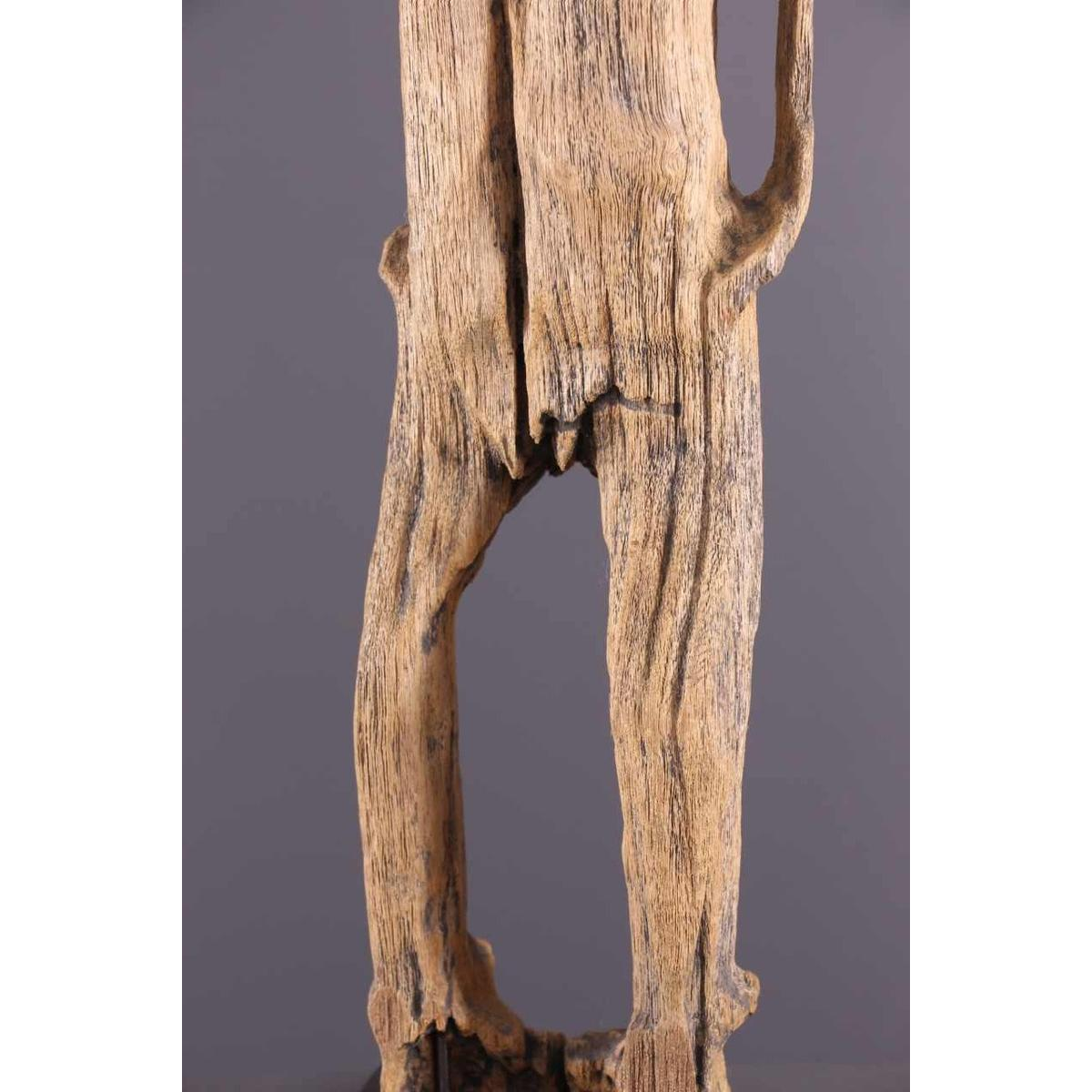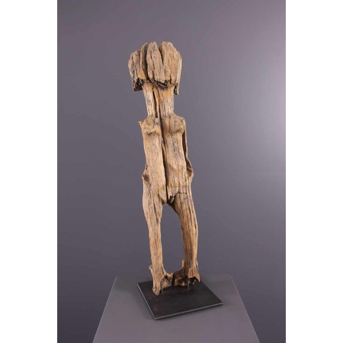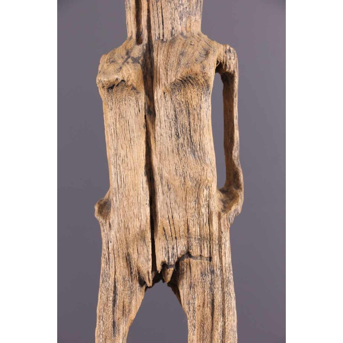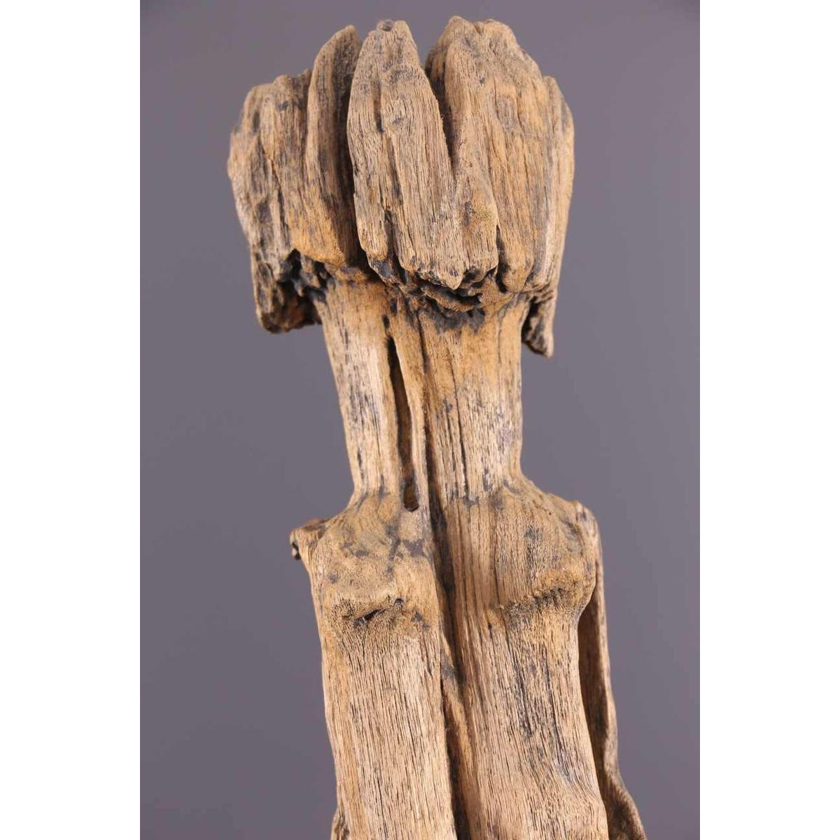 Ancestor statues are generally depicted from the front, with a straight, rigid bust. The wear and tear of time, under the effect of wind, salt and sand, has altered these sculptures, gouging and cracking the wood, giving the material a distinctive dry texture and a light, matt patina.