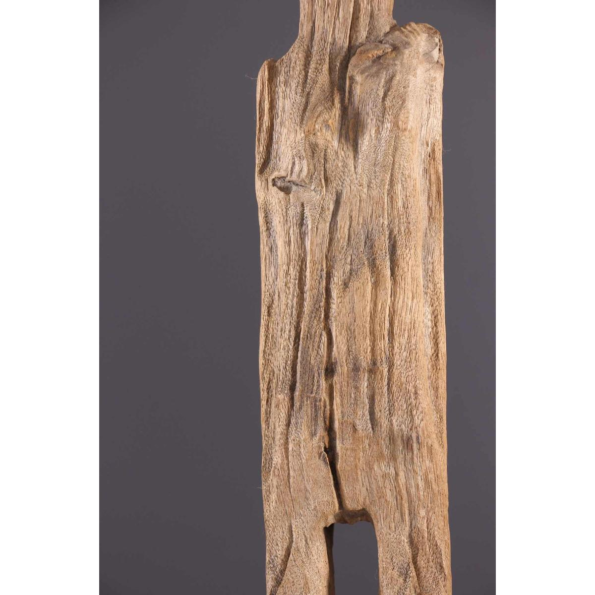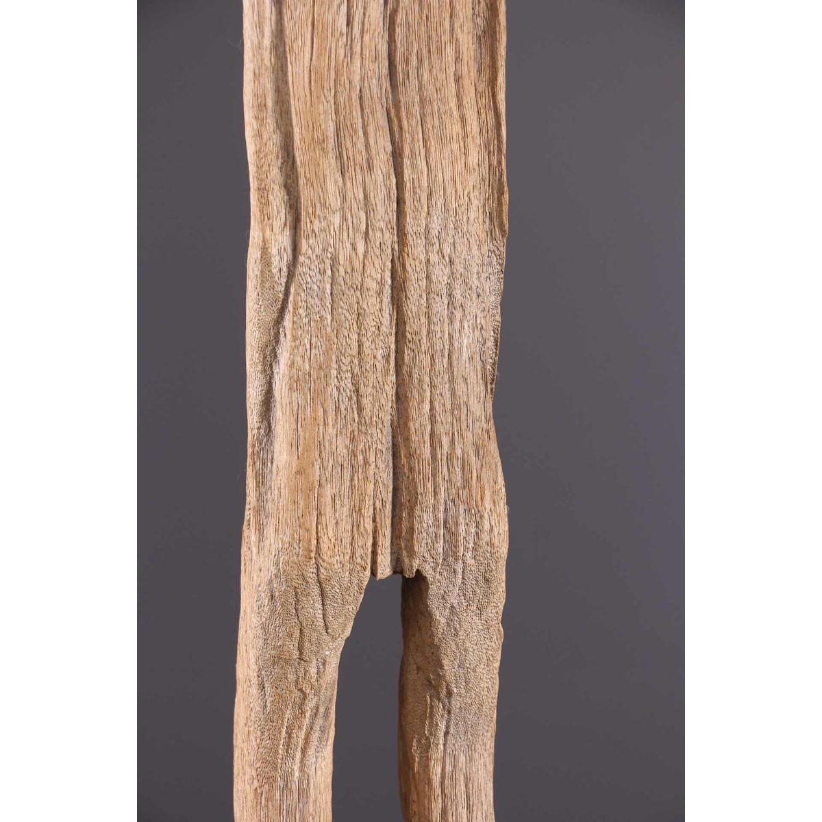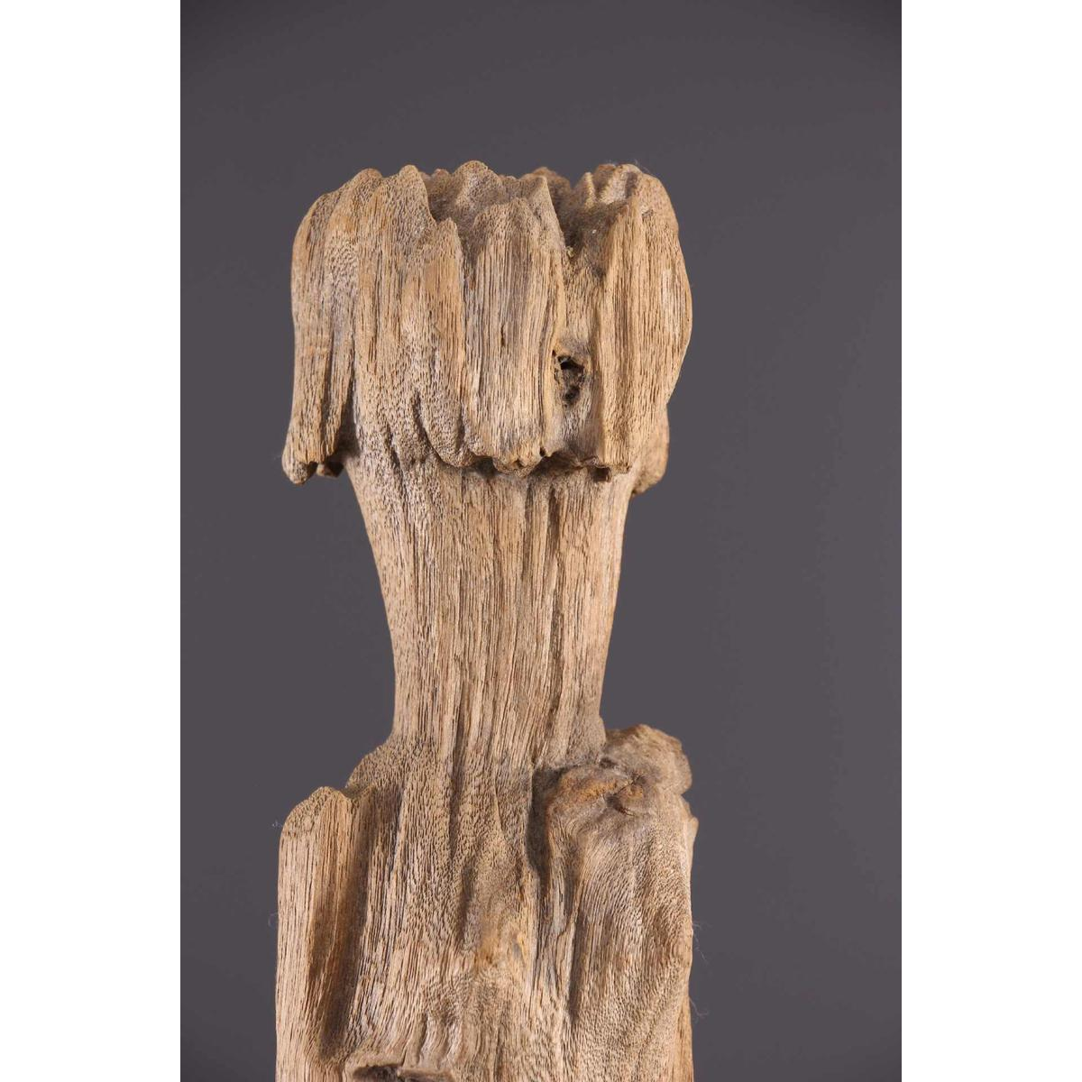 Elegant Sakalava ancestor statue from Madagascar. This female figure is depicted in the nude, with her arms clasped along her rectilinear torso. The relief of the face has been altered by the elements. Wind, salt and sand have left their mark and cracked these figures, giving the wood its characteristic dryness, resulting in an exceptional matte patina. Plinth piece.