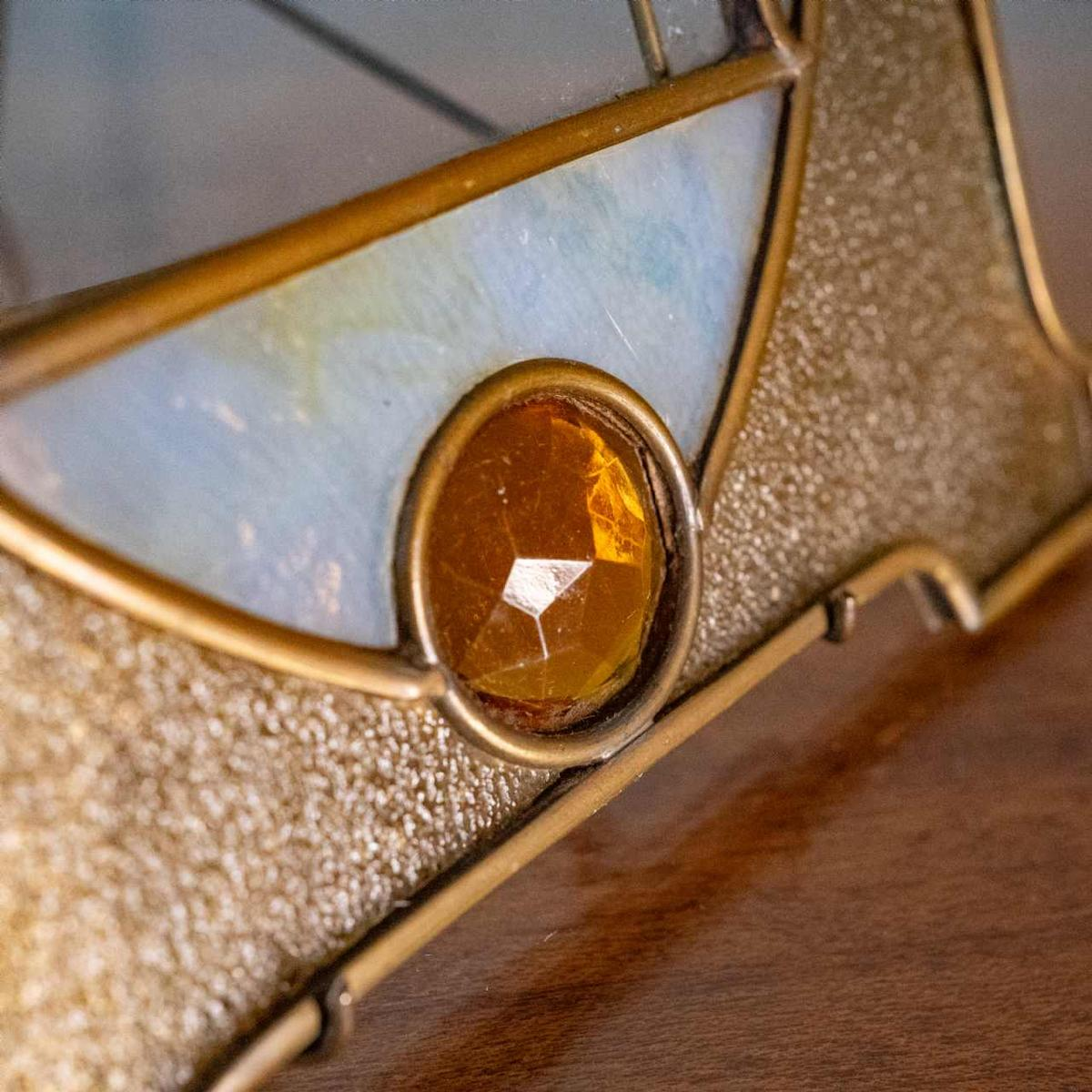 Stand-mounted brass photo holder, diamond-cut glass cabochons & stained glass.