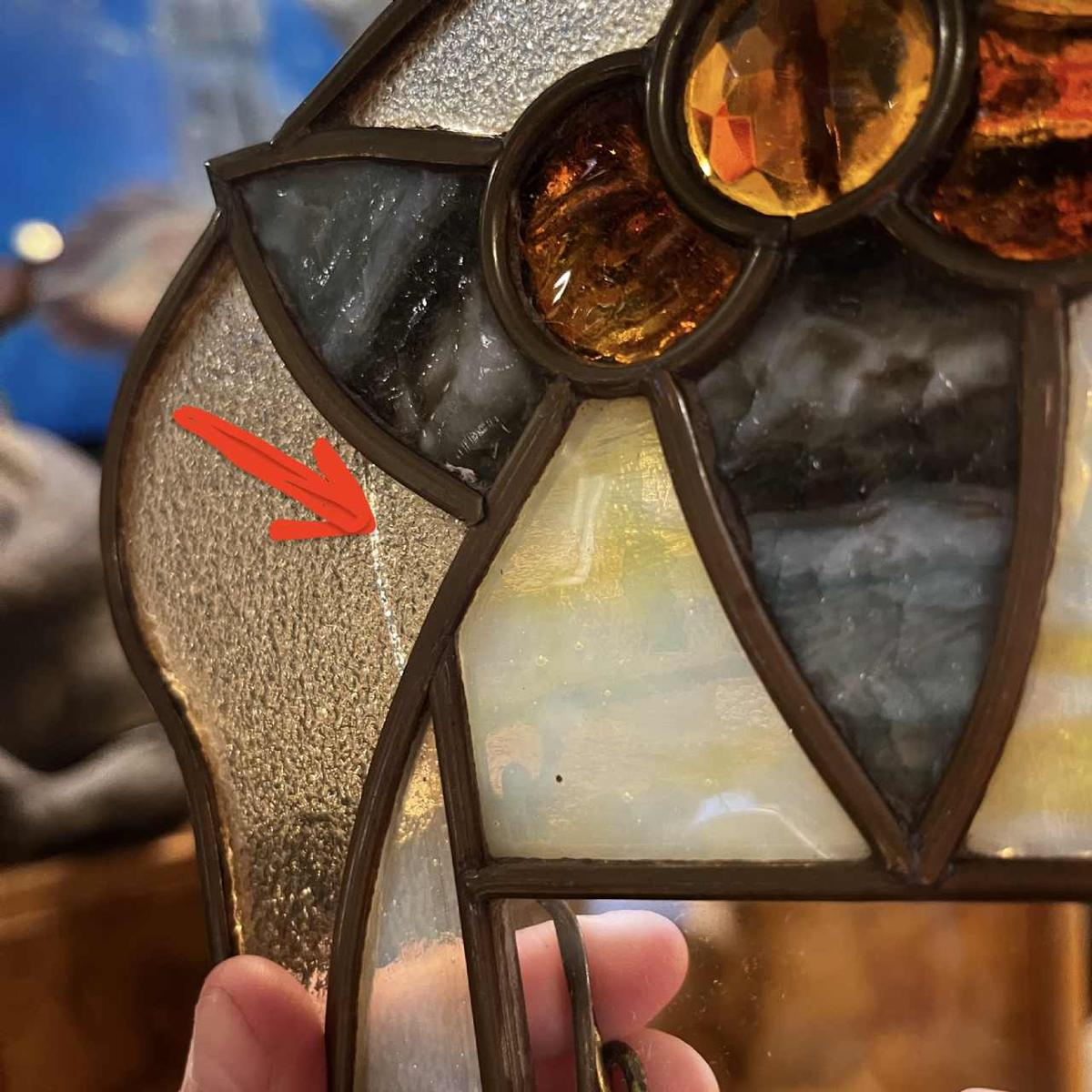 Good condition, with a slight crack in one of the glass parts (see detailed photo, red arrow).