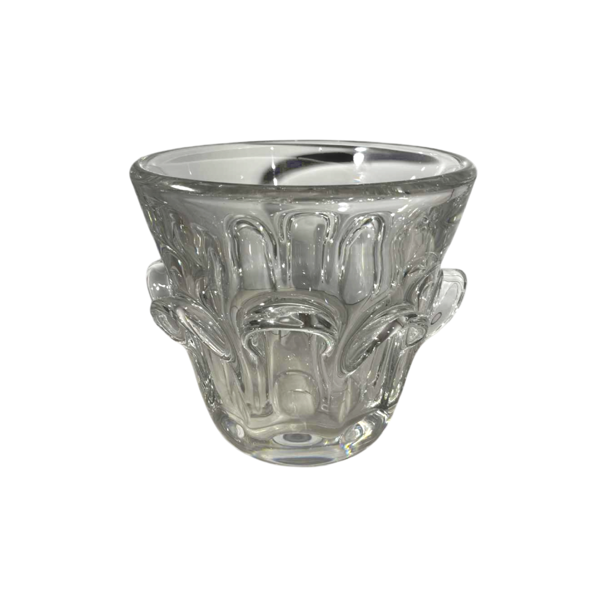Large champagne bucket made of thick (approx. 8 kg) transparent crystal, hot-moulded with stretching. Made by Antonio and/or Guido Bon at the Val Saint Lambert crystal factory in Belgium around 1950/1960. In perfect condition. Unsigned, documented (see attached photos). Note: This work can be compared to that of André Thuret for Daum in Nancy. Bibliography: Referenced in the book ‘Mardaga - La verrerie européenne'. Biography: Antonio and Guido Bon were two Italian designers active in the 1950s and 1960s. They worked in the field of furniture and decorative objects, collaborating with several European companies. In the 1960s, they created a number of pieces for the Val Saint Lambert crystal factory, including this vase. Their work is characterised by simple shapes, clean lines and a focus on function. Their creations are now sought after by collectors of 20th-century design.