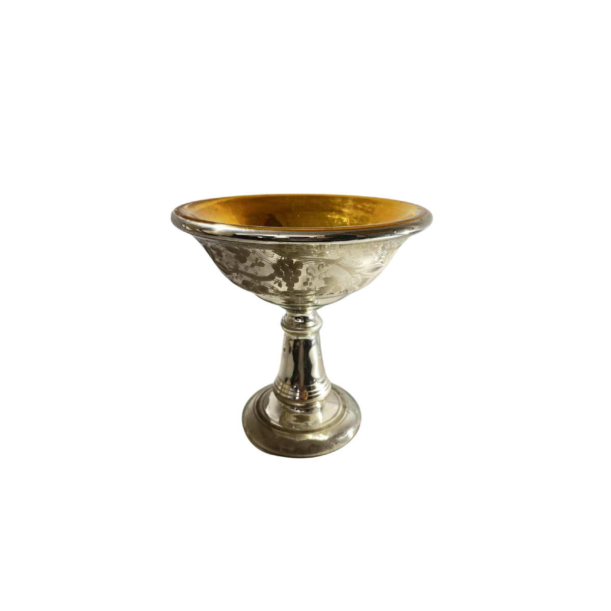 Fruit or biscuit bowl with internally silvered glass, surface decorated with acid-etched motifs (vines and foliage), gilded interior, and an elegant pedestal base.
