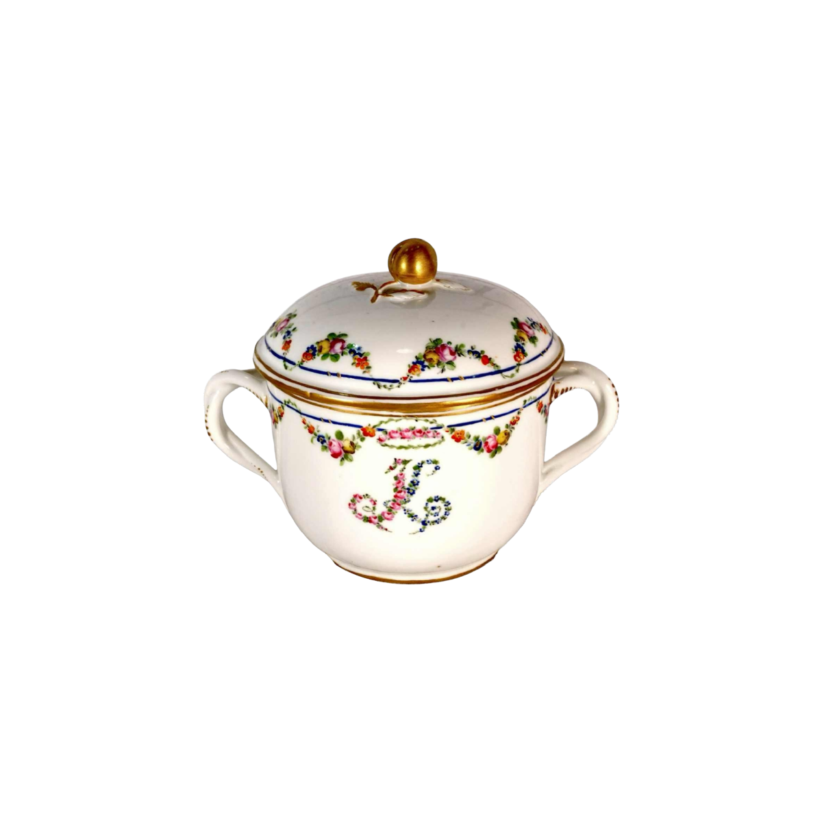 White background with polychrome monogram of flowers and foliage, crowned “JL“. Polychrome garlands of foliage and flowers and blue and gold fillet borders. The lid is fruit-shaped.