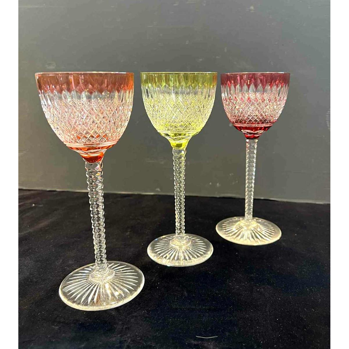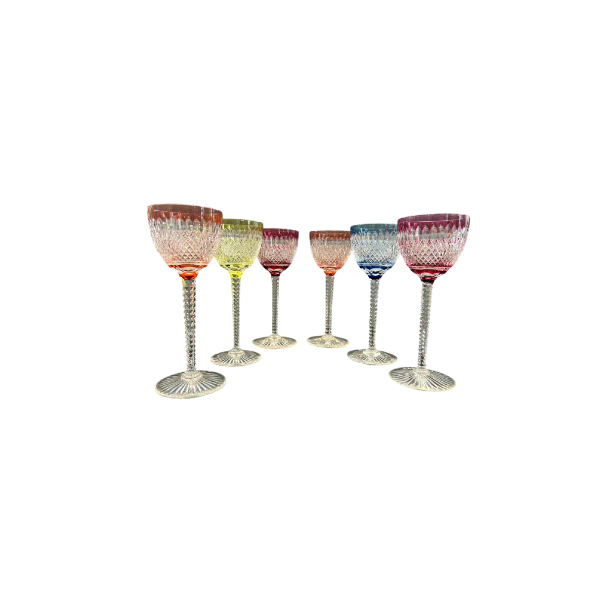Val Saint Lambert, 6 wine glasses, lined and cut clear crystal colors: red2x , aurora 2x, blue and yellow.
