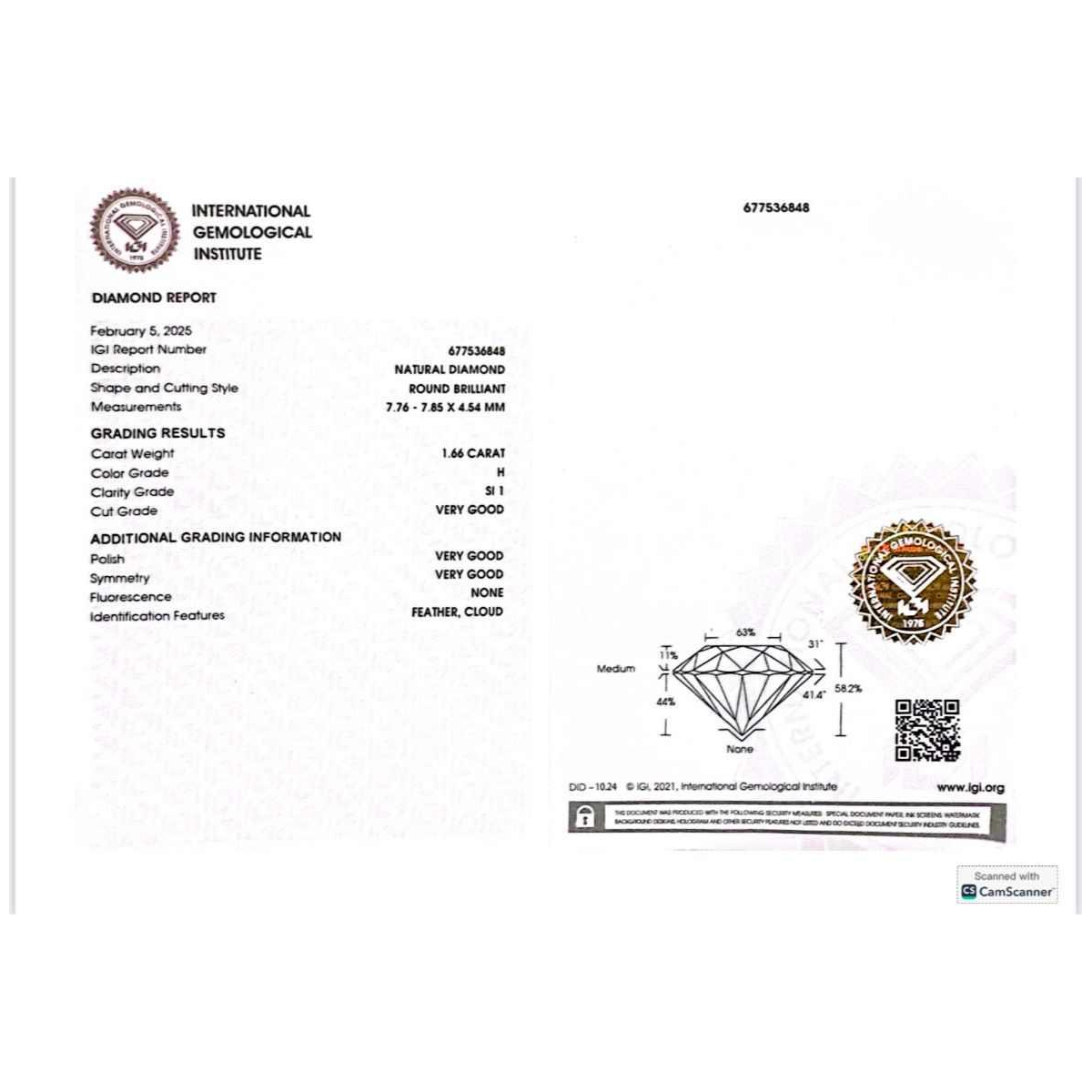 1.66 carat round natural diamond (H SI1), measuring 7.76 - 7.85 x 4.54 mm.