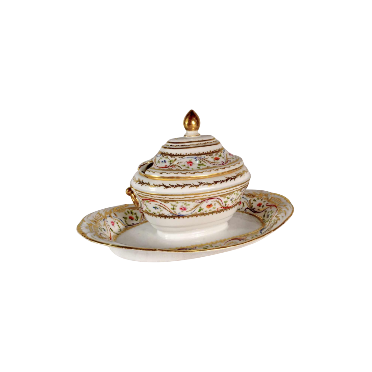 White background with polychrome and gold decoration. On the body, a band decorated with a garland of arabesques and flowering foliage. Foliage garlands and gold fillets on the edges and body. The tray and lid are similarly decorated. Gilded handles, grip and festoons.