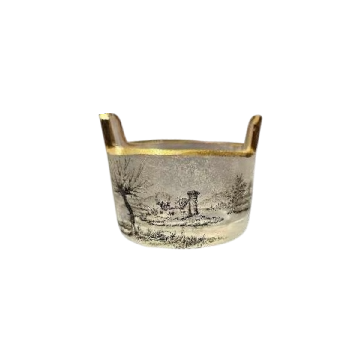 Small satin-finish glass salt cellar with black landscape design on a satin-finish background, 2cm high and 4cm in diameter.