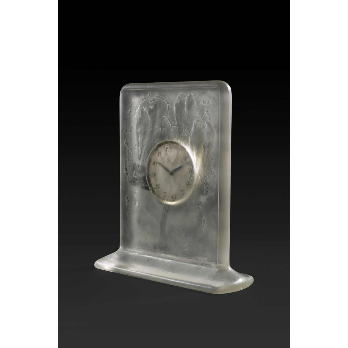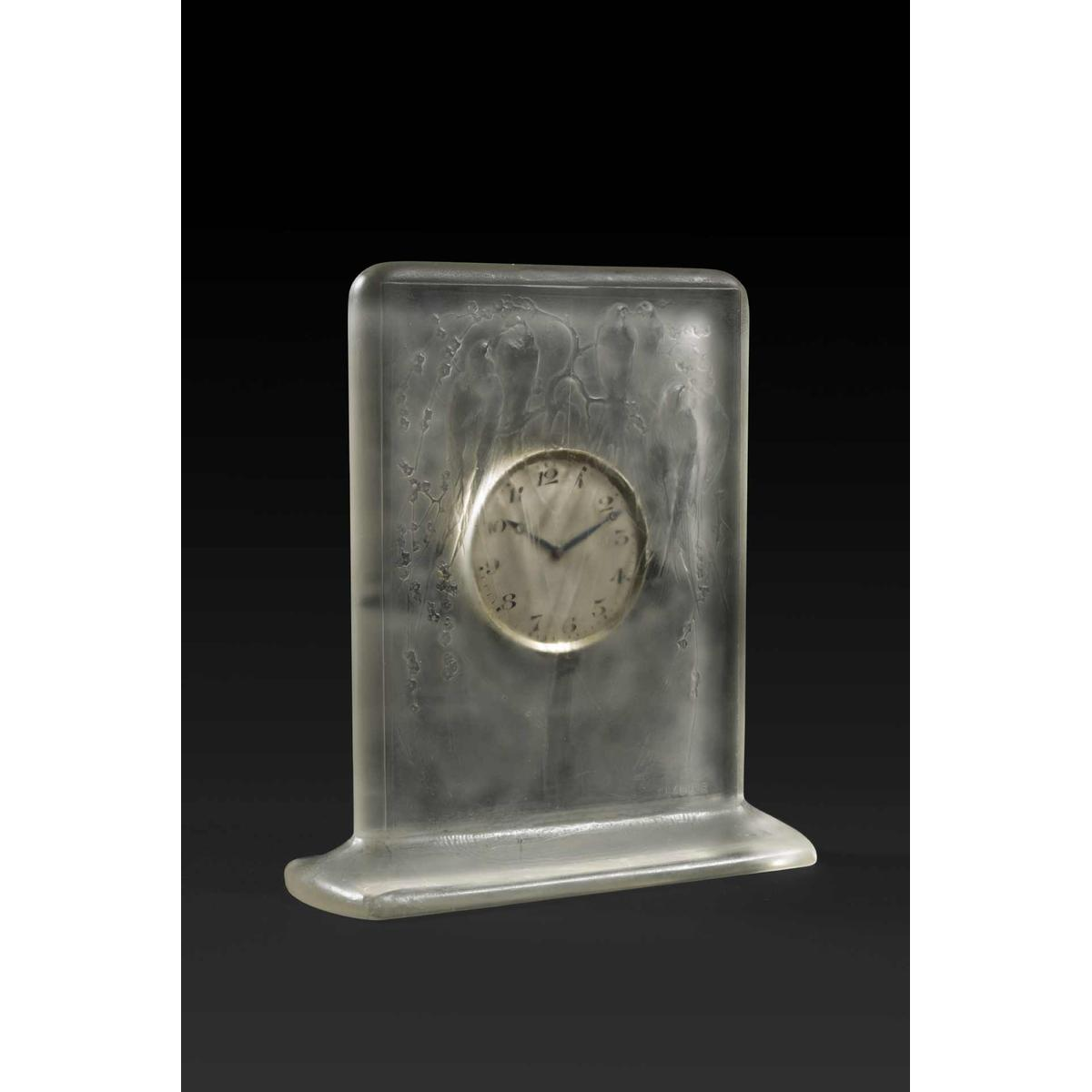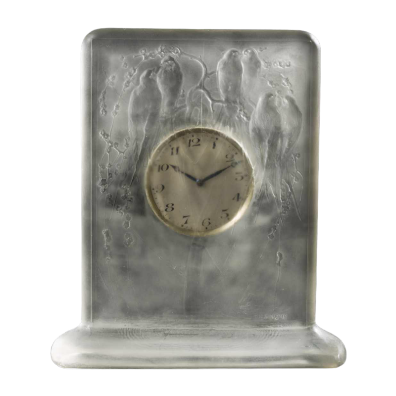 “FOUR PARROTS” is a Art Deco glass clock by RENE LALIQUE (1860-1945). Molded in relief with six parrots on tree branches in a forest scene. Swiss movement “HENRI DISTEHEIM” (indicated on the reverse dial) with an eight-day duration. Signature: “R Lalique” in relief on the front face, engraved on the lower edge. Dimensions: - H: 13.50 cm; - W: 12.50 cm (with base); - D: +/- 1 cm; Model created in 1920 in opalescent molded-pressed glass with a satin patina. Reference: « R. LALIQUE, CATALOGUE RAISONNE DE L'ŒUVRE DE VERRE », FELIX MARCILHAC, Les Editions de L'Amateur, 2011, page 376, N° 760.