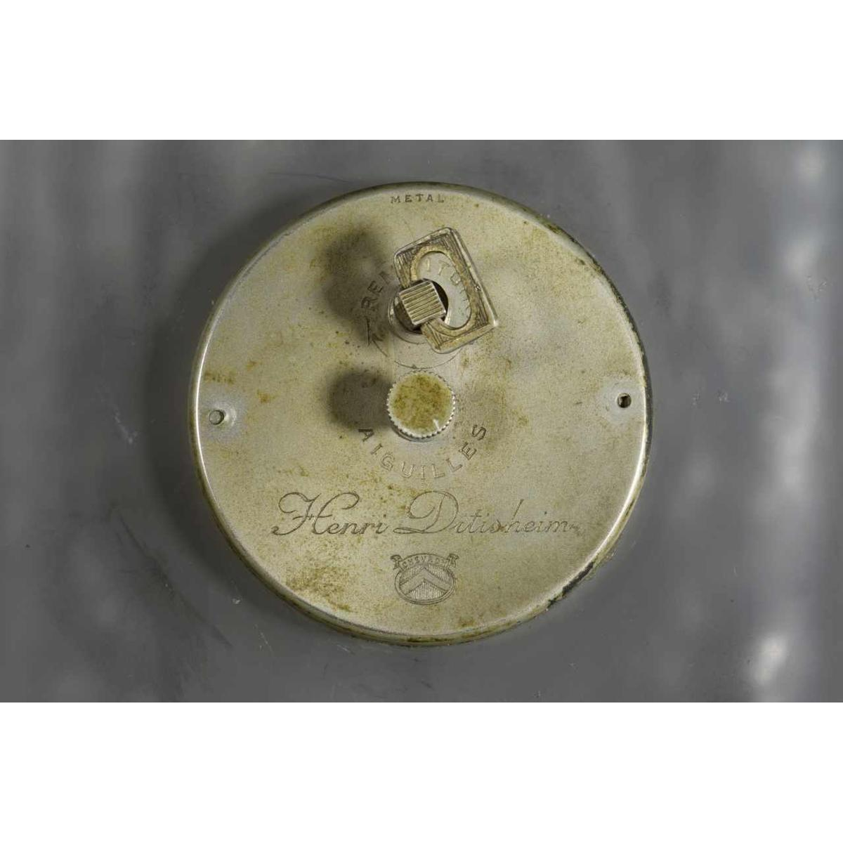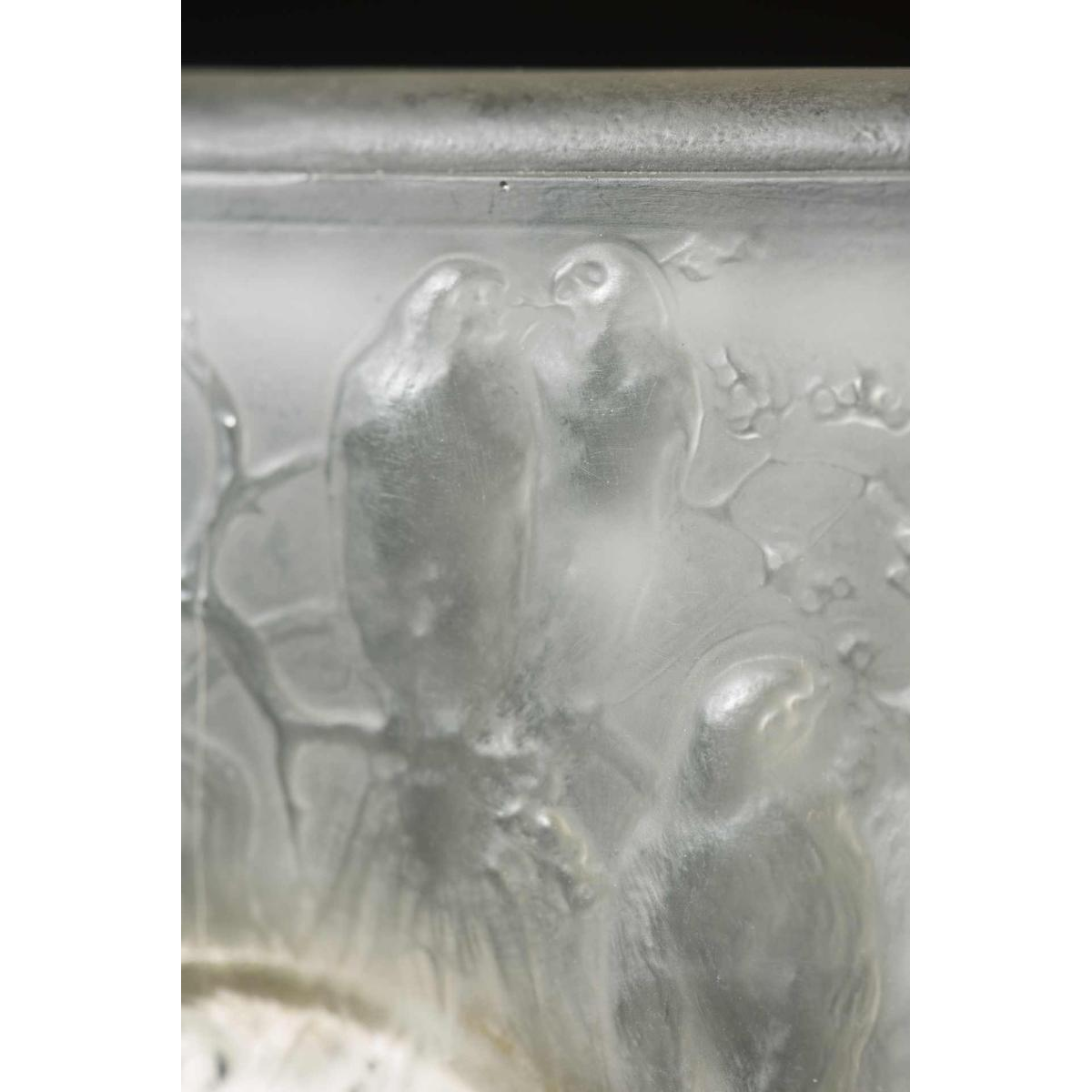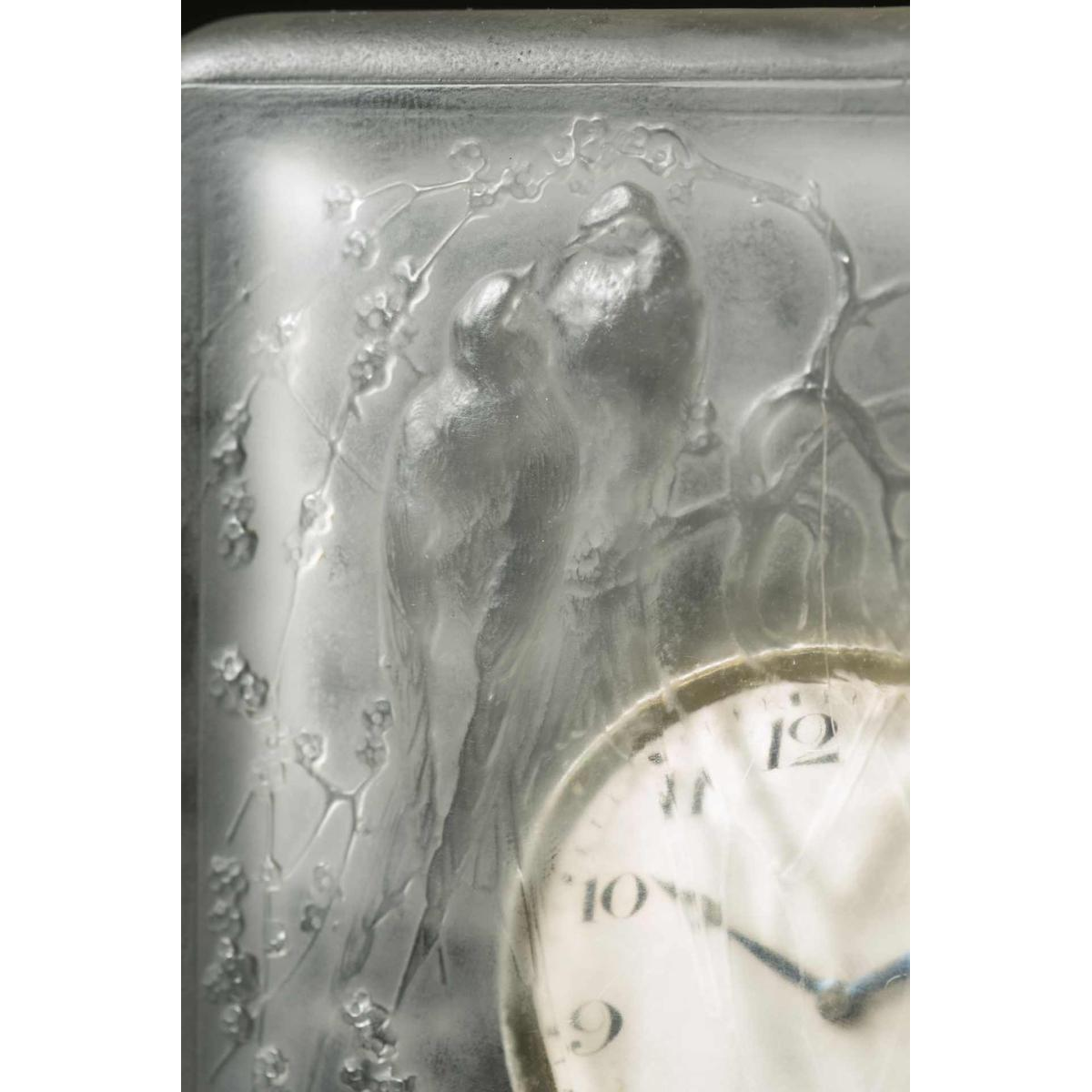 “FOUR PARROTS” is a Art Deco glass clock by RENE LALIQUE (1860-1945). Molded in relief with six parrots on tree branches in a forest scene. Swiss movement “HENRI DISTEHEIM” (indicated on the reverse dial) with an eight-day duration. Signature: “R Lalique” in relief on the front face, engraved on the lower edge. Dimensions: - H: 13.50 cm; - W: 12.50 cm (with base); - D: +/- 1 cm; Model created in 1920 in opalescent molded-pressed glass with a satin patina. Reference: « R. LALIQUE, CATALOGUE RAISONNE DE L'ŒUVRE DE VERRE », FELIX MARCILHAC, Les Editions de L'Amateur, 2011, page 376, N° 760.