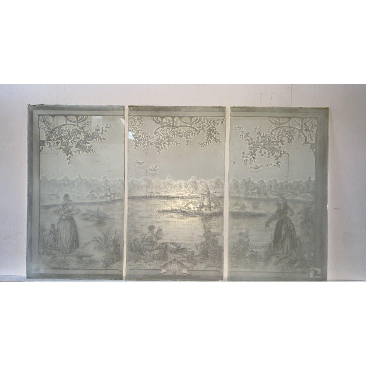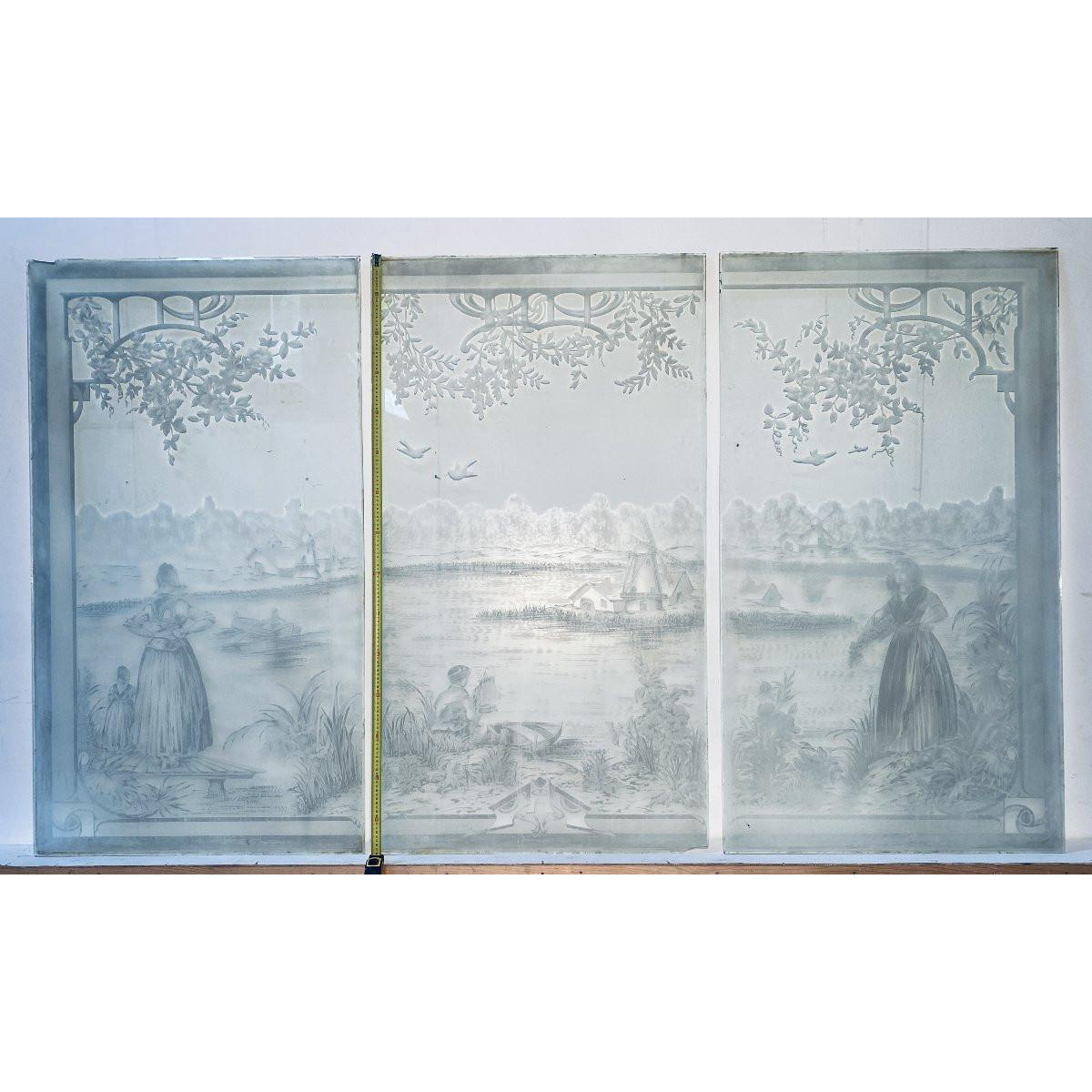 This form is only used to notify us of illegal content on product: Set of three acid-etched glass panels, "Animated Landscape, Figures," late 19th century.