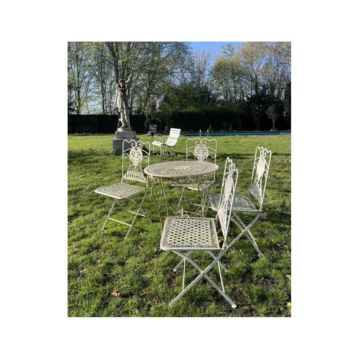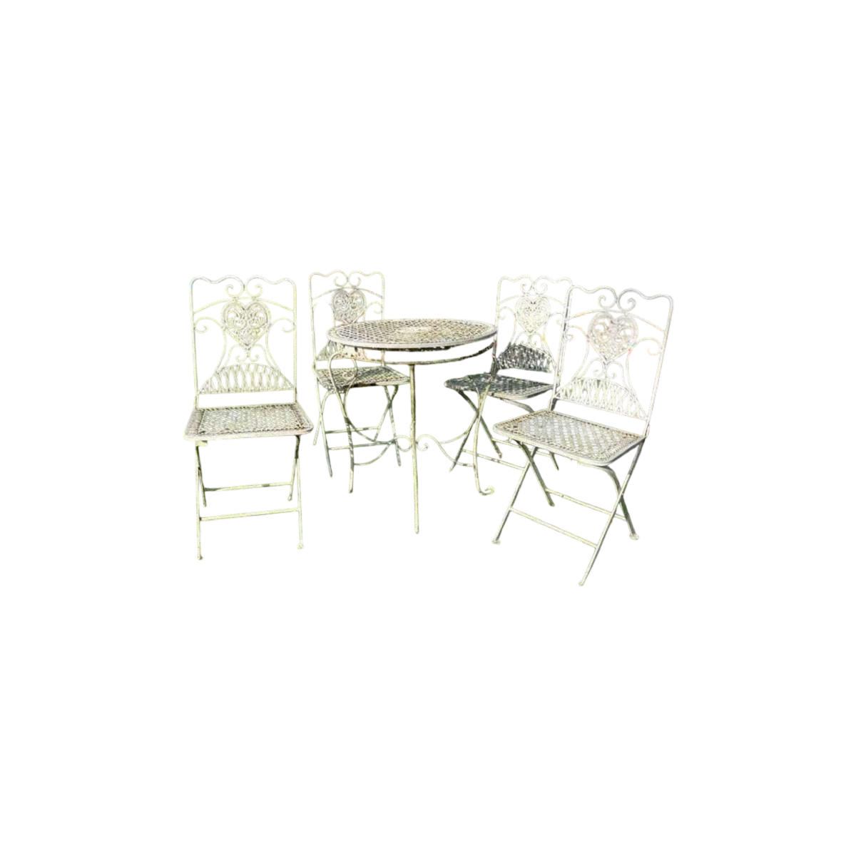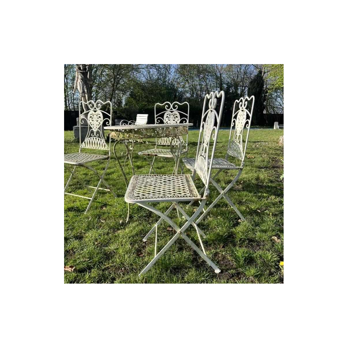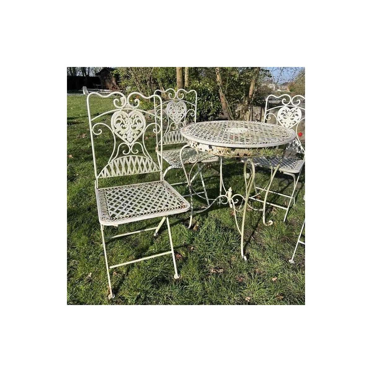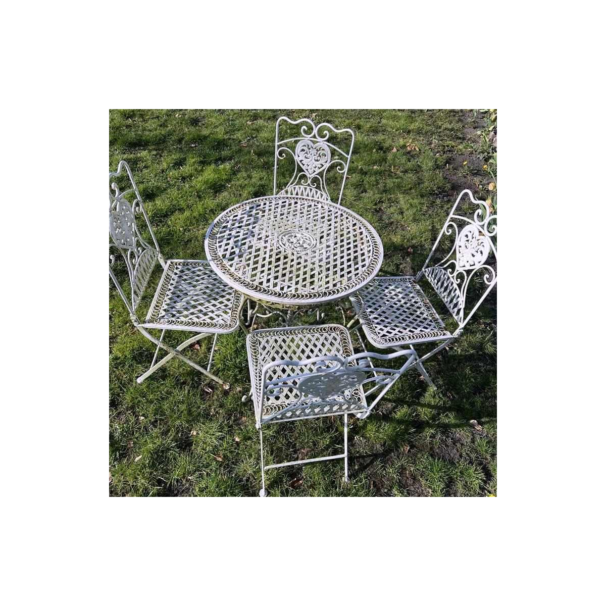 Set consisting of a table and 4 folding chairs in white painted wrought iron.