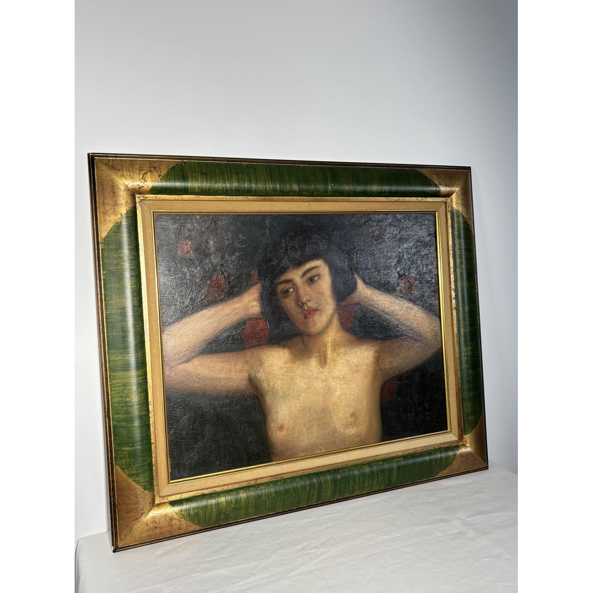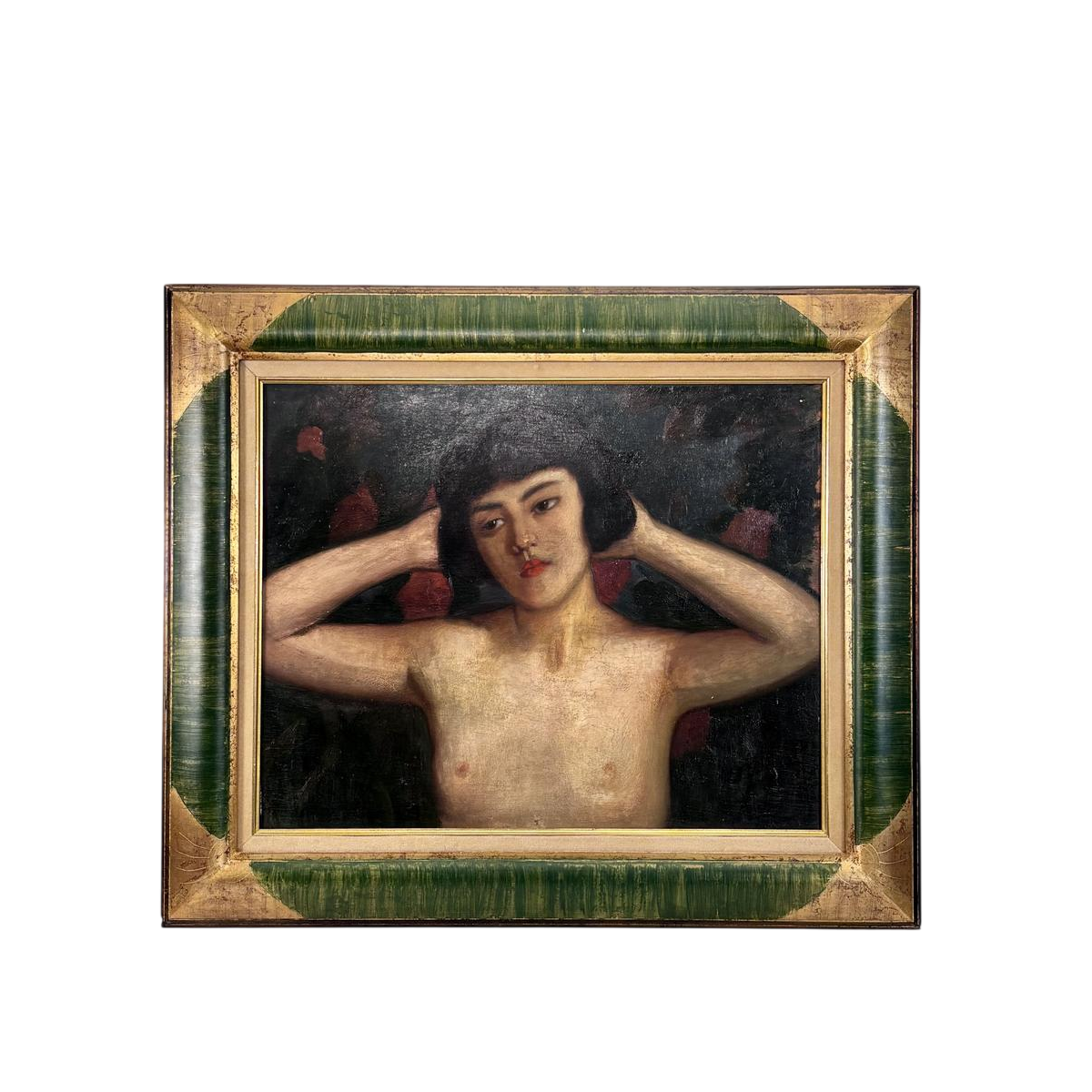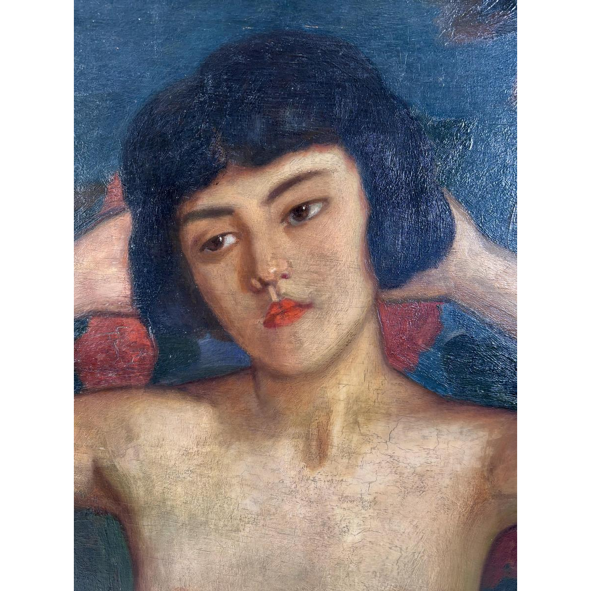 Oil on panel depicting a portrait of a young woman's bust, arms raised behind her head, in an attitude that is both free and introspective.