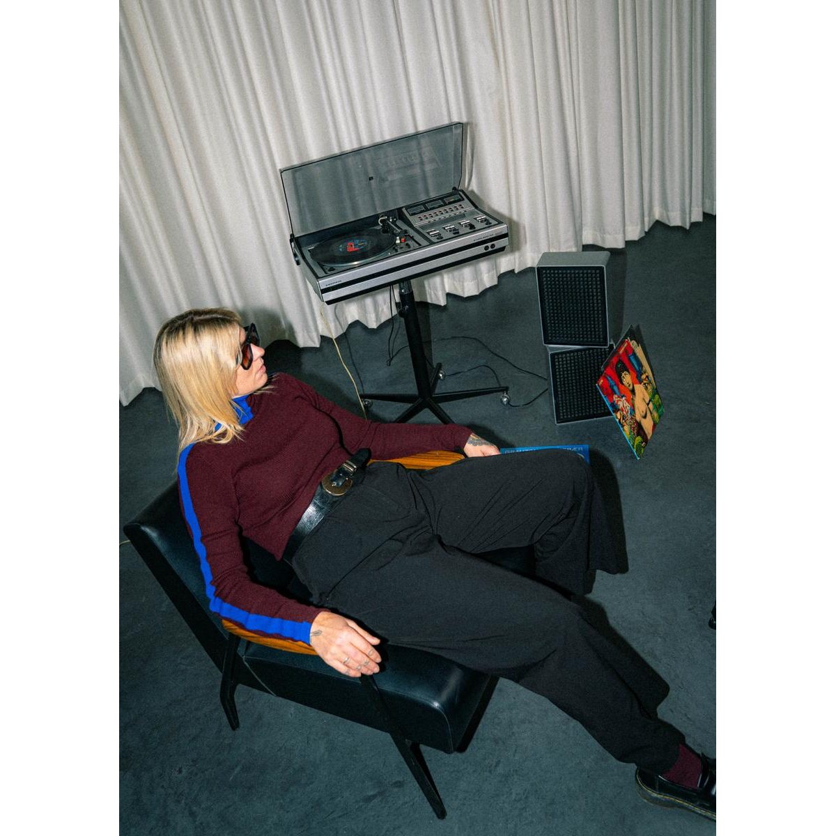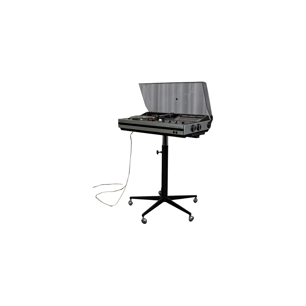 This Hi-Fi studio comes with a star-shaped stand on casters and is in good working order. This piece shows signs of wear and patina related to age and use, such as scratches on the plastic cover.