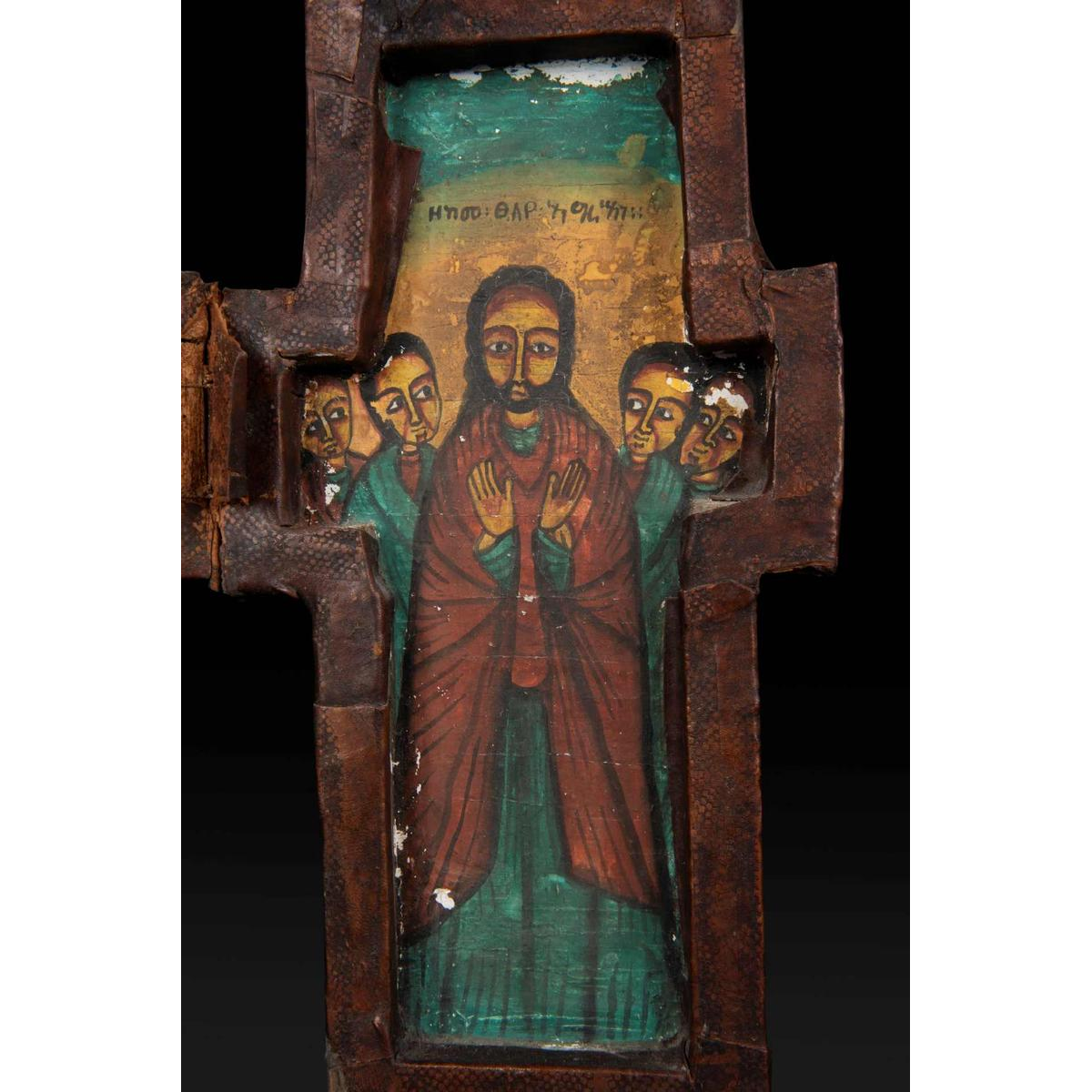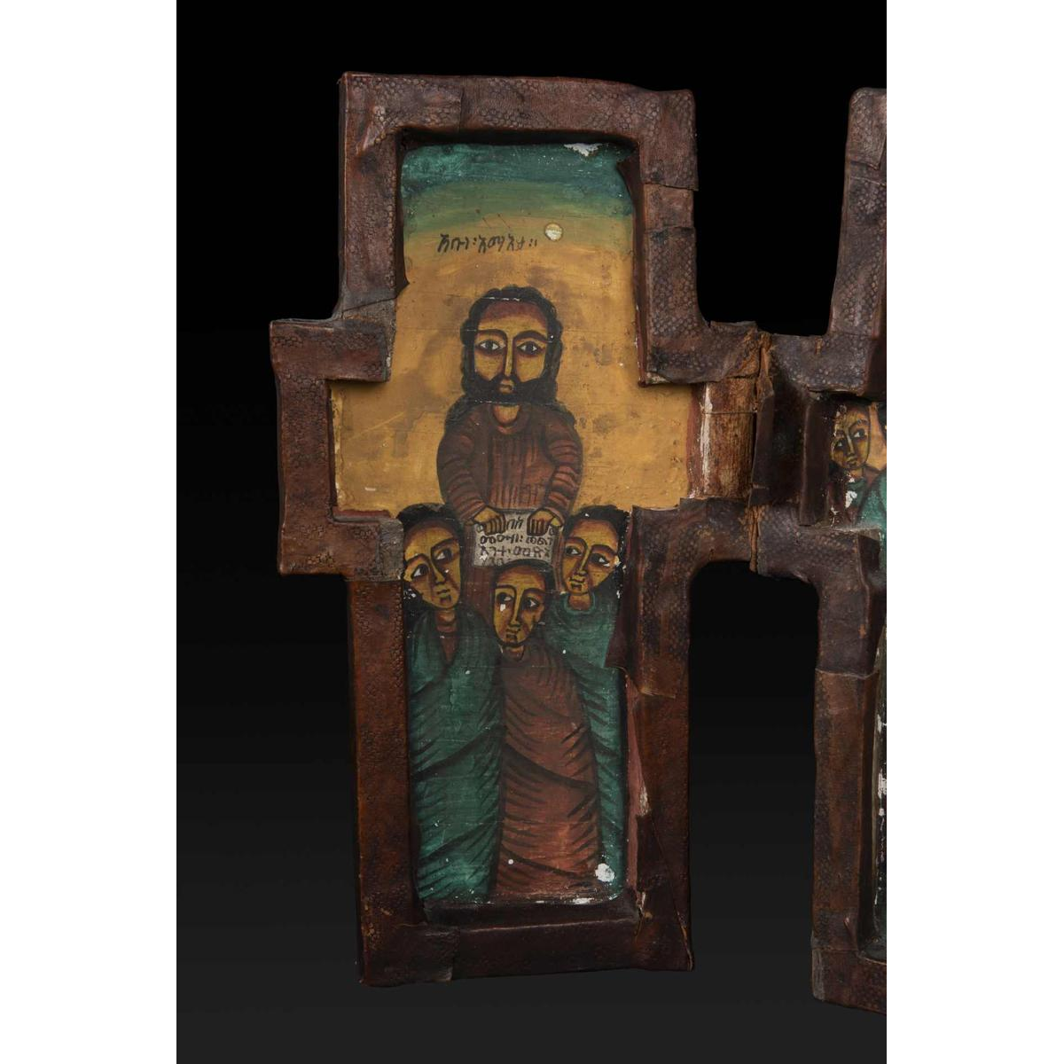 This Ethiopian icon is a finely carved and painted wooden diptych cross, decorated inside and out.