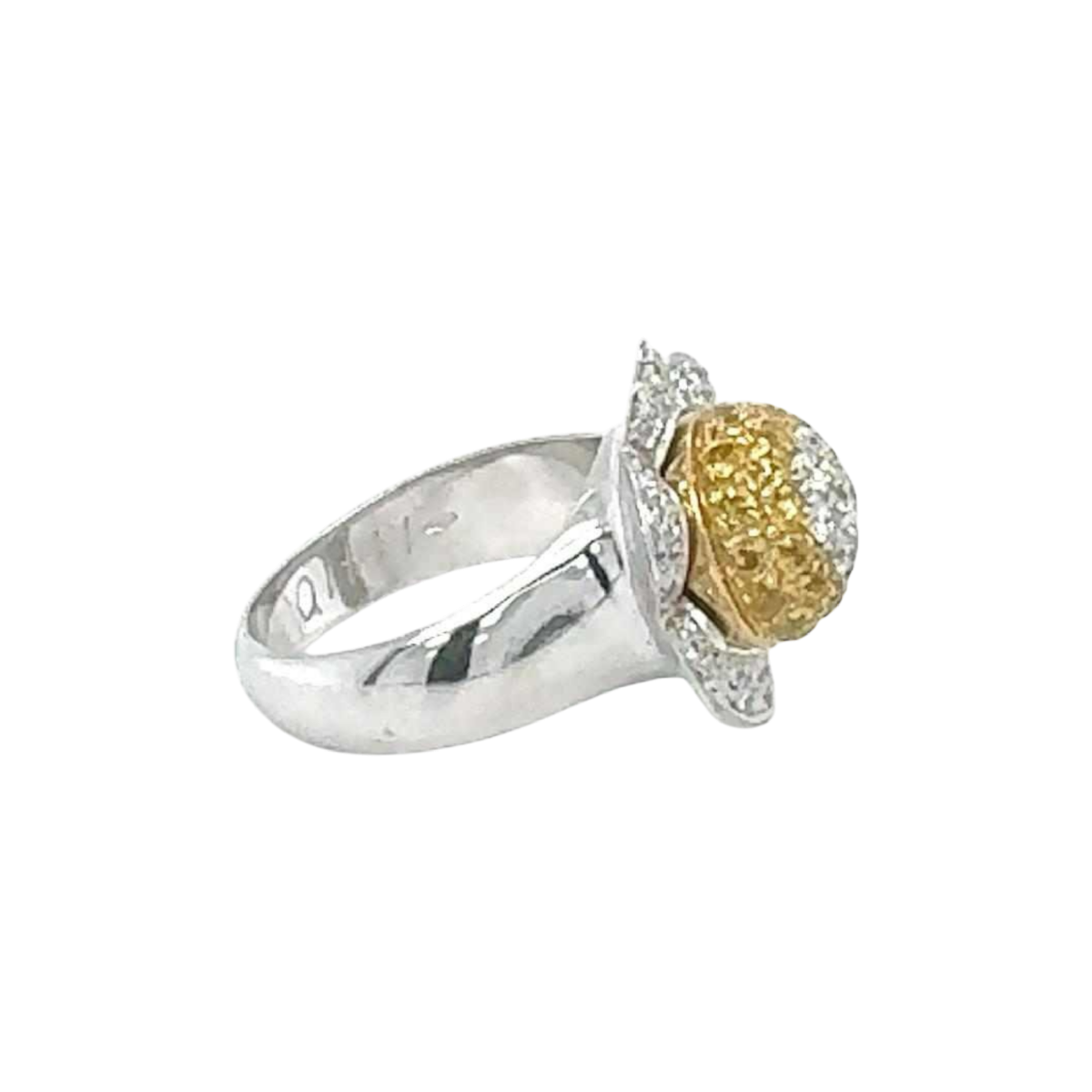 Ring: White gold Diamonds: White and yellow, total weight 0.35 carat Sapphire: Yellow, weight 1.50 carat Gold weight : 12.5 grammes