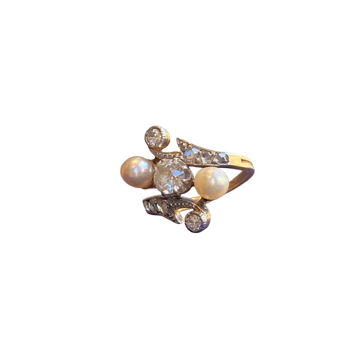 Belle Époque ‘toi & moi’ ring in gold and platinum, with old-cut diamonds and pearls, ca 1900