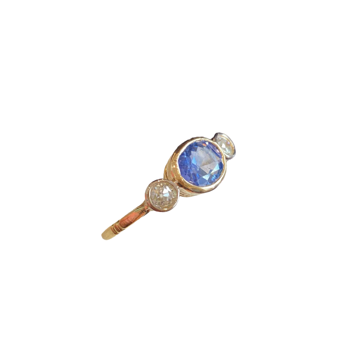 Delicate old-fashioned two-gold ring set with a sapphire in the center and two old-cut diamonds in a closed setting.