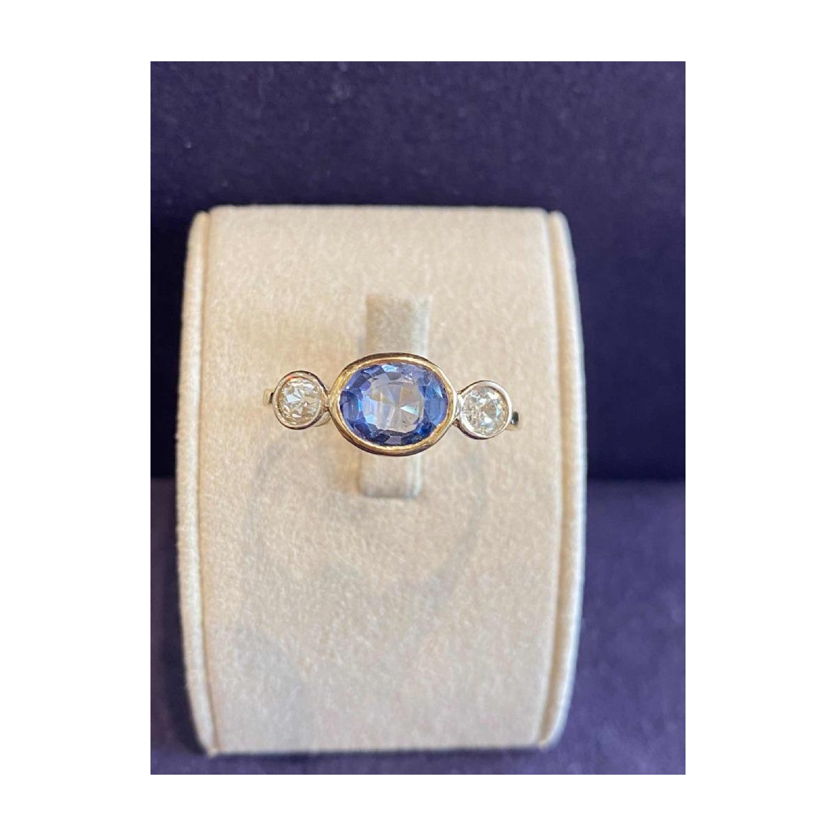 Stones: two old-cut diamonds (total weight approx. 0.56 carats) and an oval-cut sapphire (total weight approx. 2.97 carats).