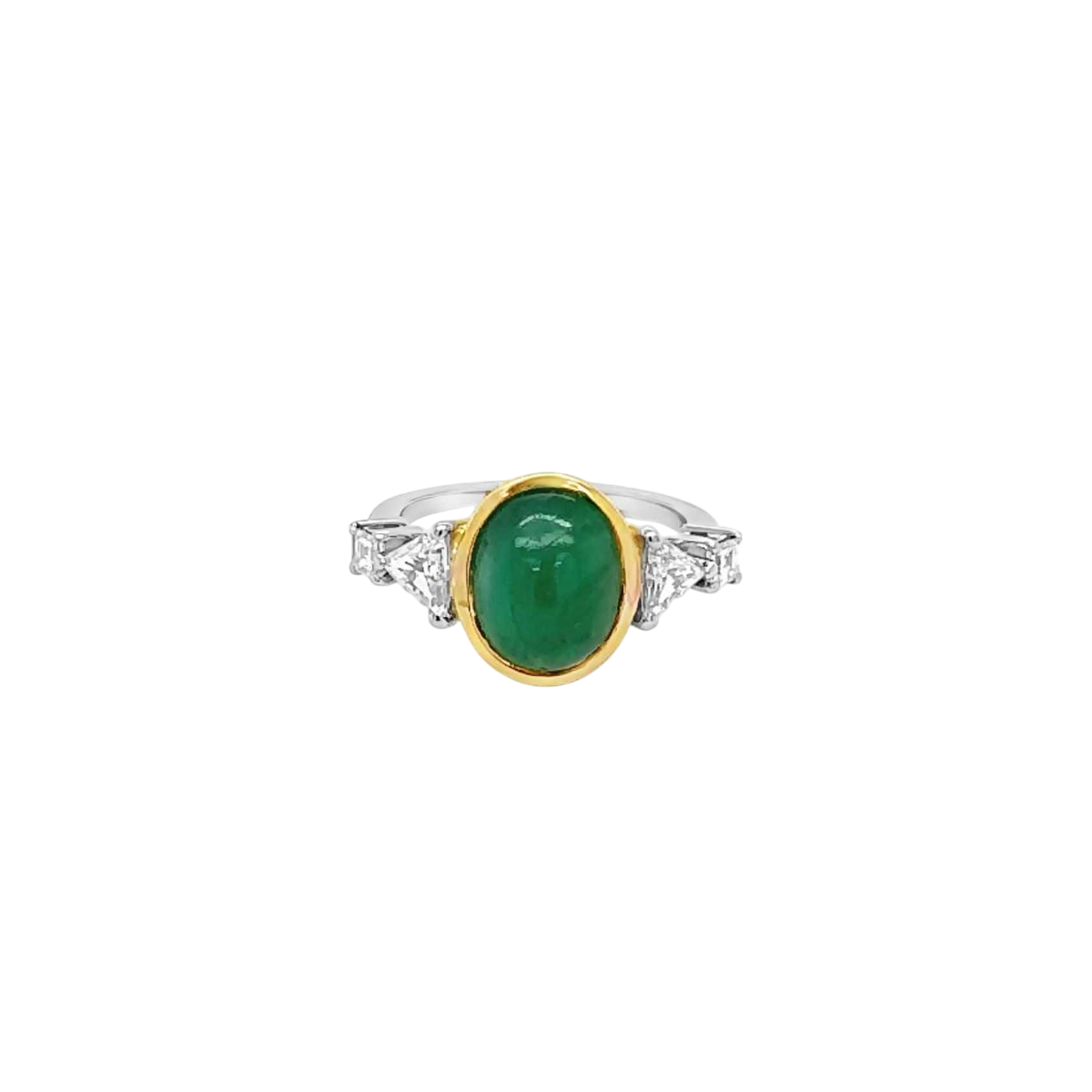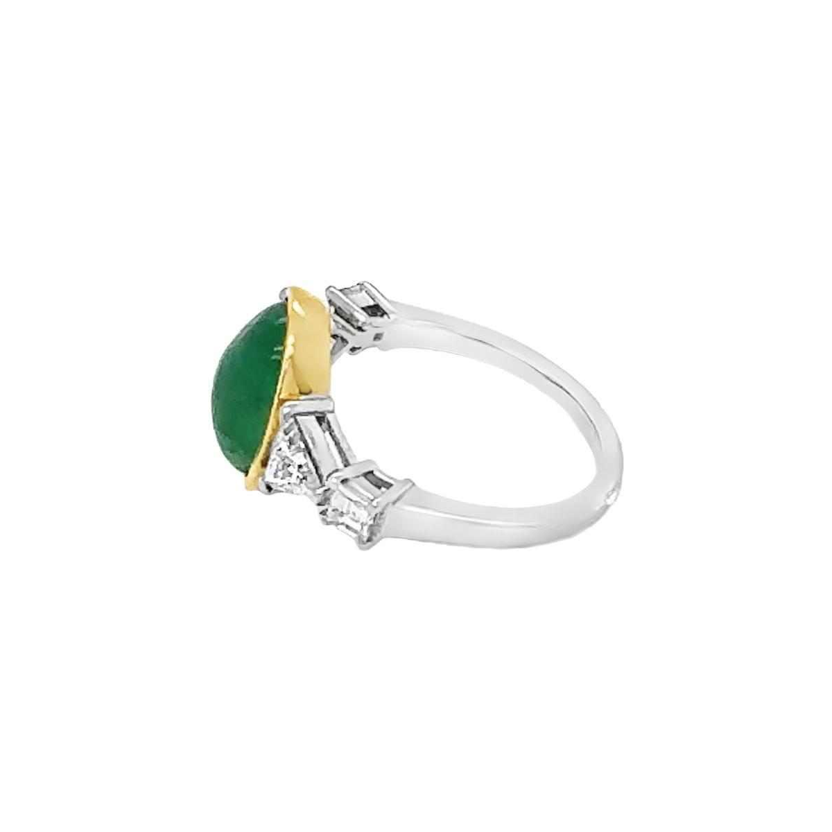 Emerald : Weight: 3.26 carats Shape: Cabochon (smooth dome) Diamond : Total weight: 0.70 carat Shape: Triangular Ring size : 53 The value of the ring will depend on the quality of the stone.