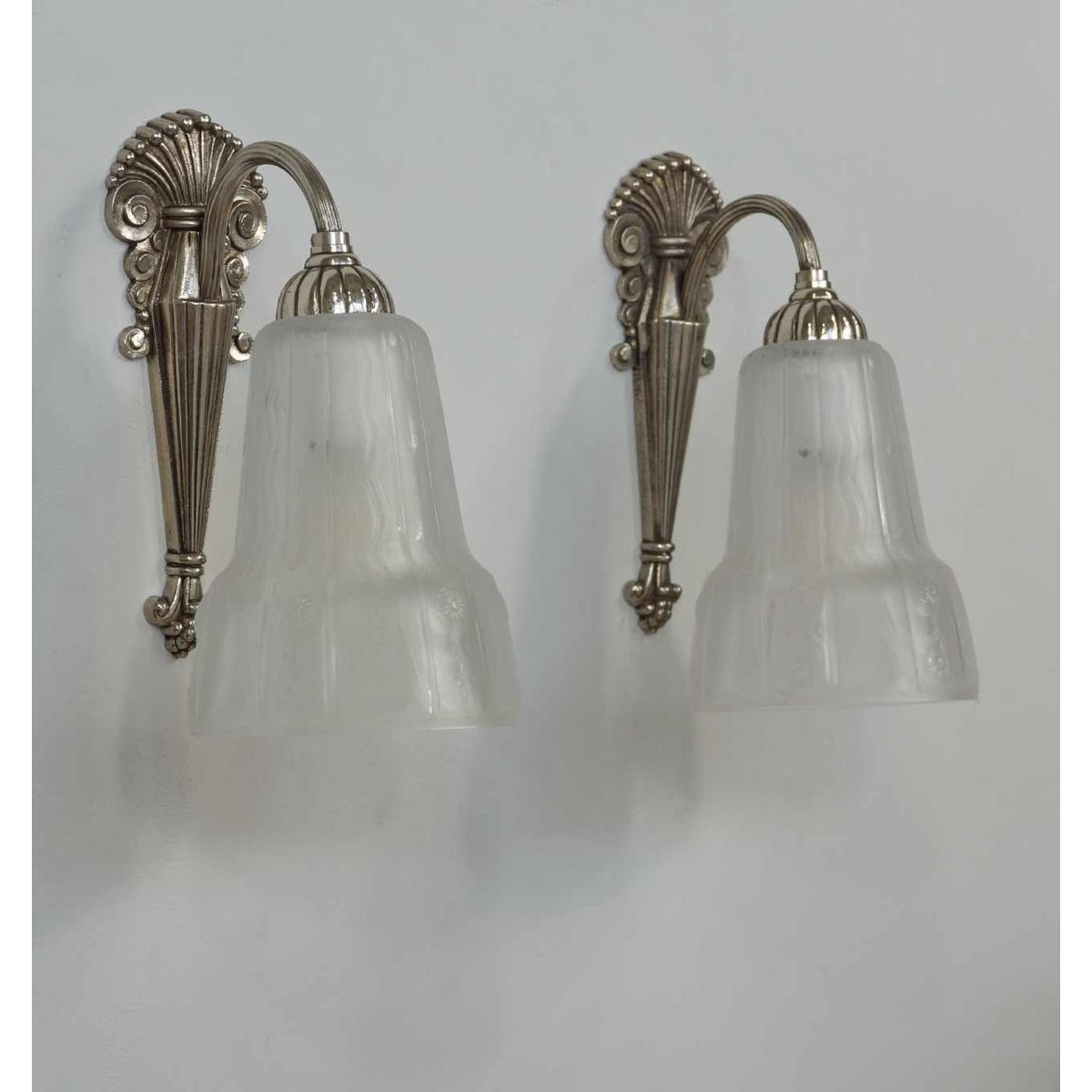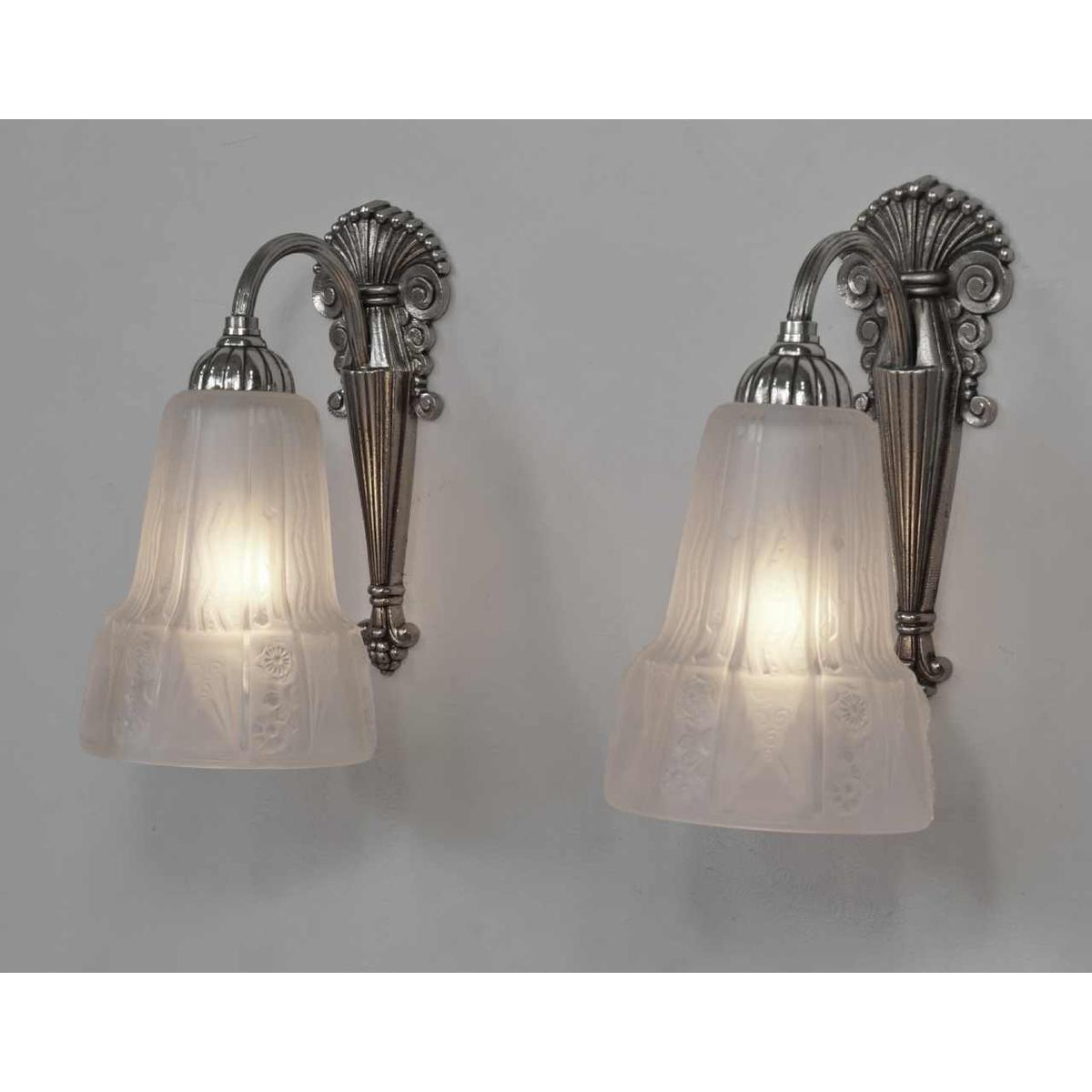 A stunning pair of 1925-1930 French art deco wall lights in nickel on cast solid brass or bronze holding shades in frosted moulded-pressed glass. It's a nice model by Muller frères the famous glass factory in Luneville France during the interbellum. The fixtures make a beautiful match with the design of the shade. The mounts show the foundery marks AR for A.Richard. A producer of bronze and iron lighting fixtures based 28bis rue Popincourt in Paris. The wall lights are 21 cm high (8,27) and they project 15 cm from the wall. They are in very good condition. I have renickeled and patinated the fixtures. The sconces are rewired with E14 sockets so you can use our modern light bulbs for them. I will add two good quality LED bulbs to the parcel. For the US Canada or Japan I will wire them with American candelabra base sockets. For European countries I will place E14 ones.