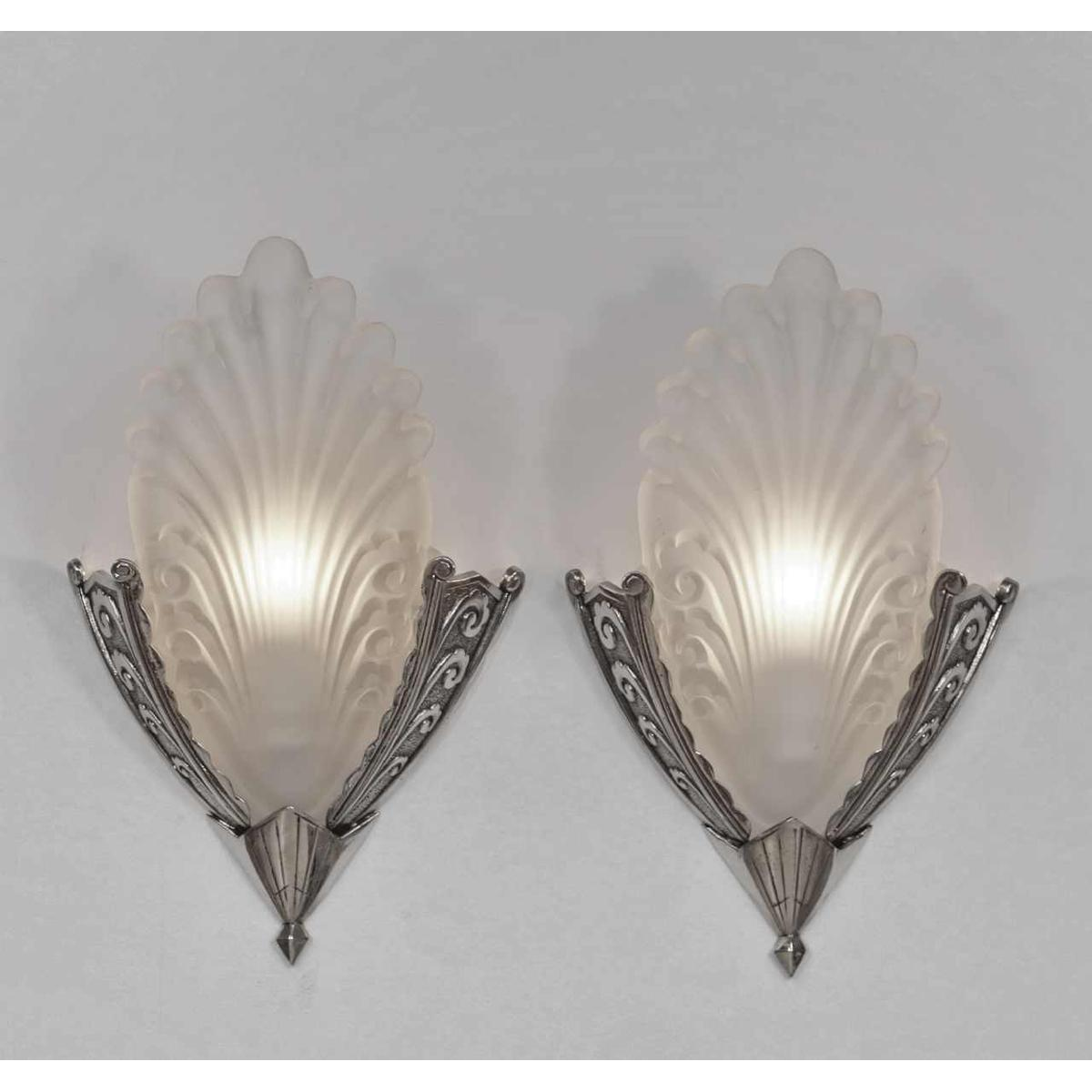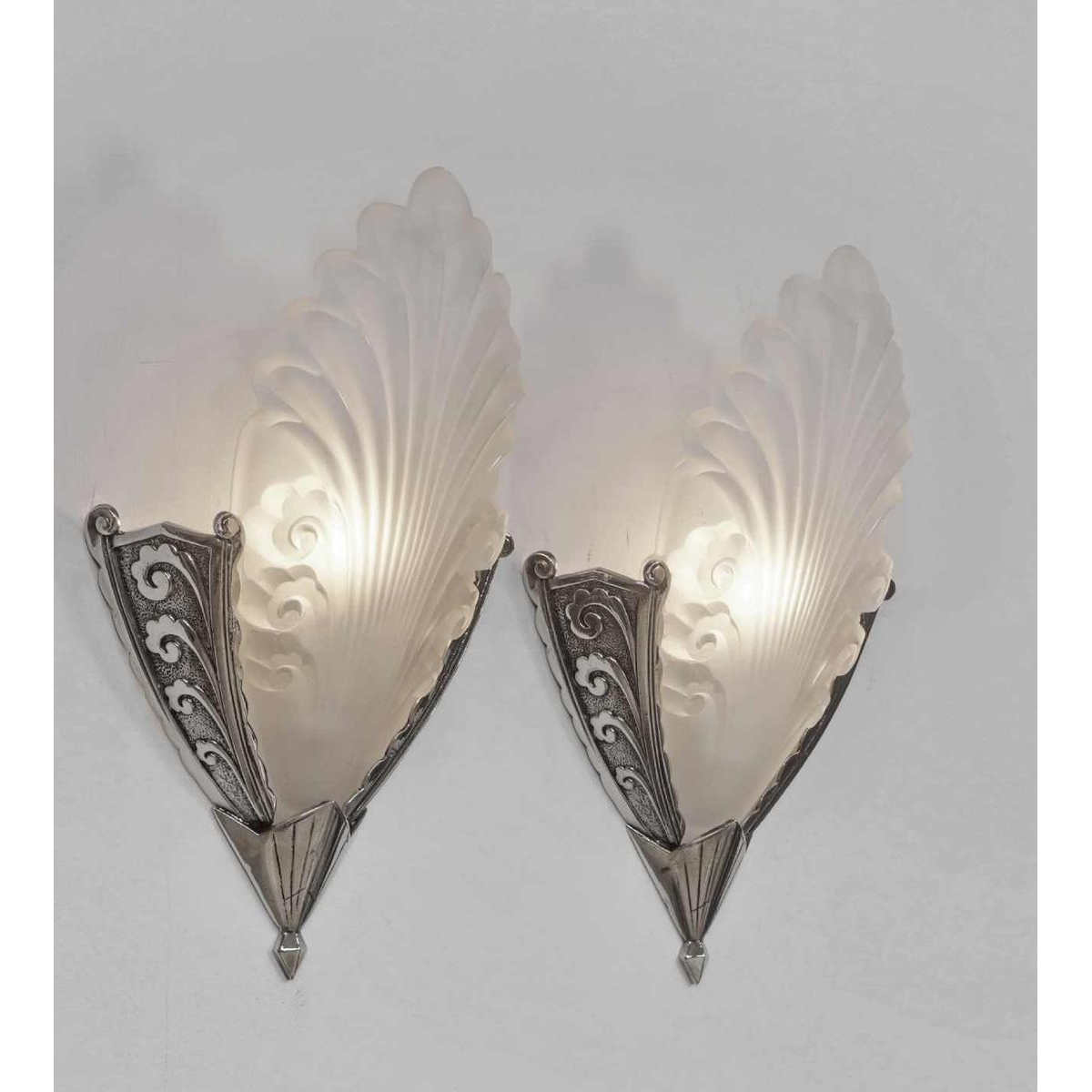 H.Mouynet A beautiful pair of 1925-1930 French art deco wall lights in nickel on cast solid brass holding thick glass panels in frosted moulded-pressed glass. The sconces were made by Henri Mouynet. Mouynet was a producer of bronze and forged iron lighting fixtures. He had a large company in Paris working mainly in a neo-classical style but he made lamps sconces and chandeliers in modern (art déco) style as well. In 1926 he built a huge building at 11 rue Etienne Marcel prolongée (nowadays named Roger Verlomme street). After the crisis he was forced to sell it. H.Markhbeinn, who had a business importing and distributing bohemian glasses from eastern europe, bought the place in 1937. The wall sconces are represented in the old Mouynet catalog (see last picture). The shades make a wonderful match with the brass mounts depicting the same decoration. They were done in clear glass that was frosted by acid and localy polished to give them glossy highlights. It is unknown which glass factory made these shades for mouynet. The sconces are 32,5 cm high (12-51/64) and have a lenght of 21,8 cm. They project 12 cm from the wall. And are in very good condition. I have renickeled and patinated the fixtures. The sconces are rewired with E14 sockets so you can use our modern light bulbs for them. I will add two good quality LED bulbs to the parcel. For the US Canada or Japan I will wire them with American candelabra base sockets. For European countries I will place E14 ones. The wall lights will be shipped by priority mail. Safely packed and fully insured. Free shipping offered for Belgium France Holland or Germany. A pick up in Rotterdam is possible as well.