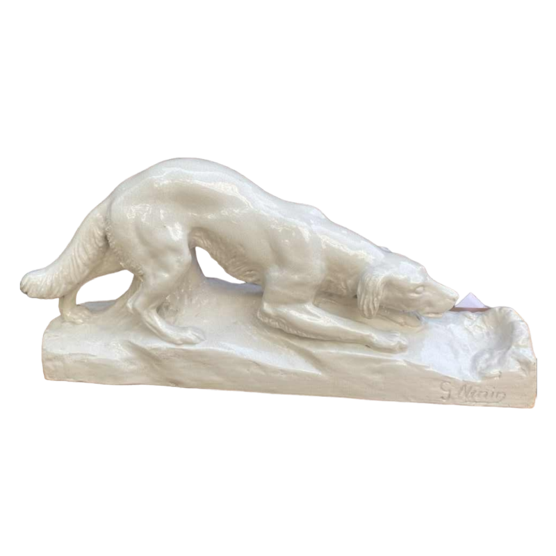 G. Ninin chien ceramic / earthenware sculpture, crackled white, ca 1930