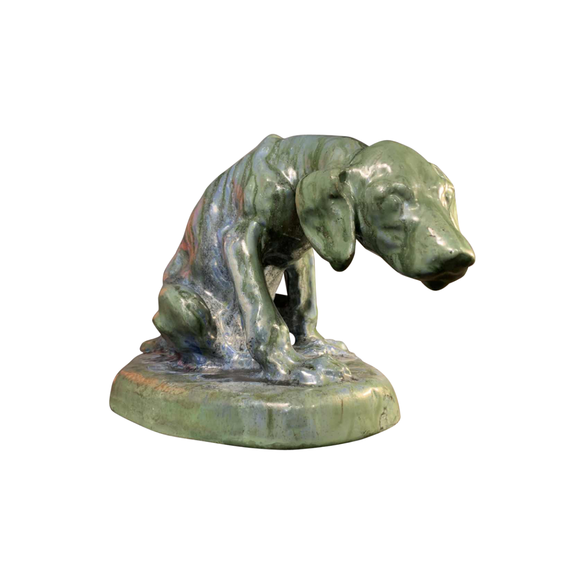 Sculpture by Domien Ingels representing a hunting dog (Braque type) edited in 'grand feu salted sandstone' by Roger Guérin in Bouffioulx in the 1920s, green and blue enamelling with crystallizations, rare and qualitative piece. In the mind of Arthur Craco.