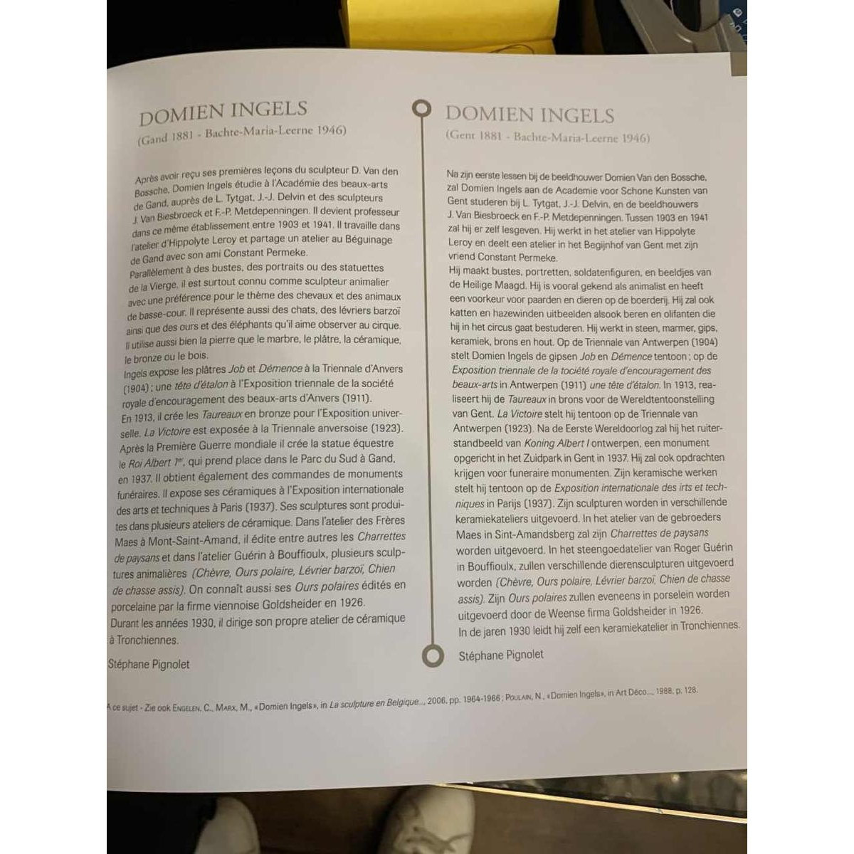 Born in 1881, Domien Ingels is one of the best Belgian sculptors of the Art Deco period, like Alberic Collin, Thierry Van Rijswijck or Raymond de Meester de Betzenbroeck .... Son of a butcher, Ingels is best known for his powerful animal figures. , both in attitude and gesture (Draft horses, farmyard animals, dogs such as the Borzoi greyhound), his favorite subject nevertheless remains the draft horse. Pieces edited in Bronze, porcelain stoneware (Roger Guérin and Ceramaes, Maes), Terracotta, plaster ...