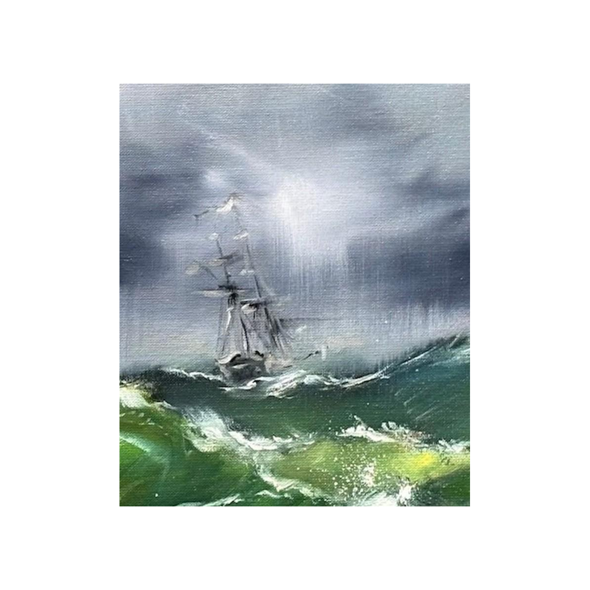 "A luminous wave rises beneath a dark sky, while a ship continues its journey on the horizon. Light emerges in the heart of the tumult."