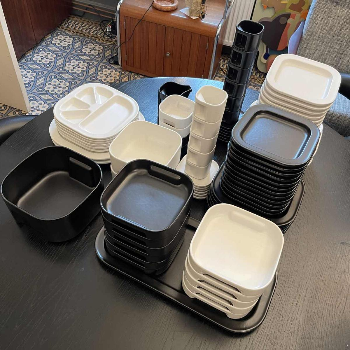 The “Square” service, produced in the 1970s by Laveno Ravelli for Arnolfo di Cambio and designed by Japanese designer Makio Hasuike, is an icon of table design from the period. Made in black and white glazed ceramic, it is distinguished by its square and rectangular geometric shapes, modularity, and the characteristic black/white contrast typical of Hasuike's minimalist aesthetic.