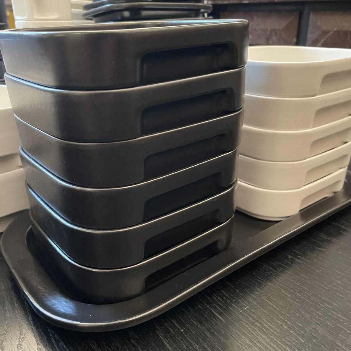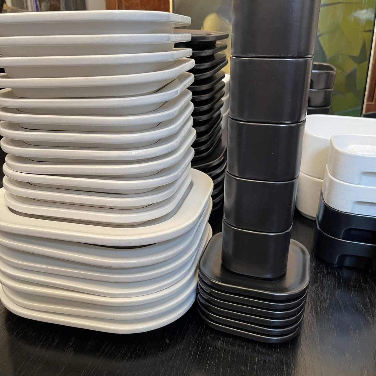 • 12 black dinner plates, 20 x 20 cm (1 with a small chip, see photo)