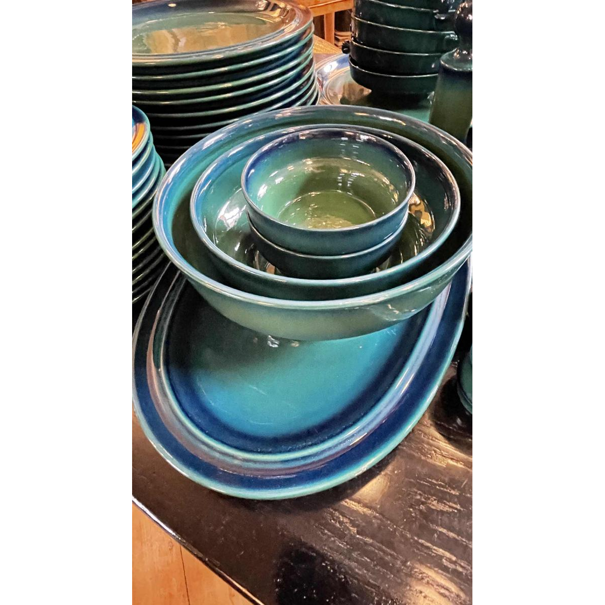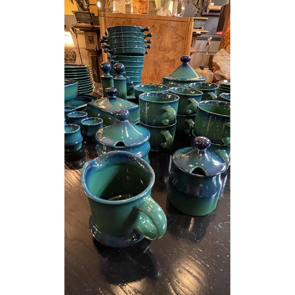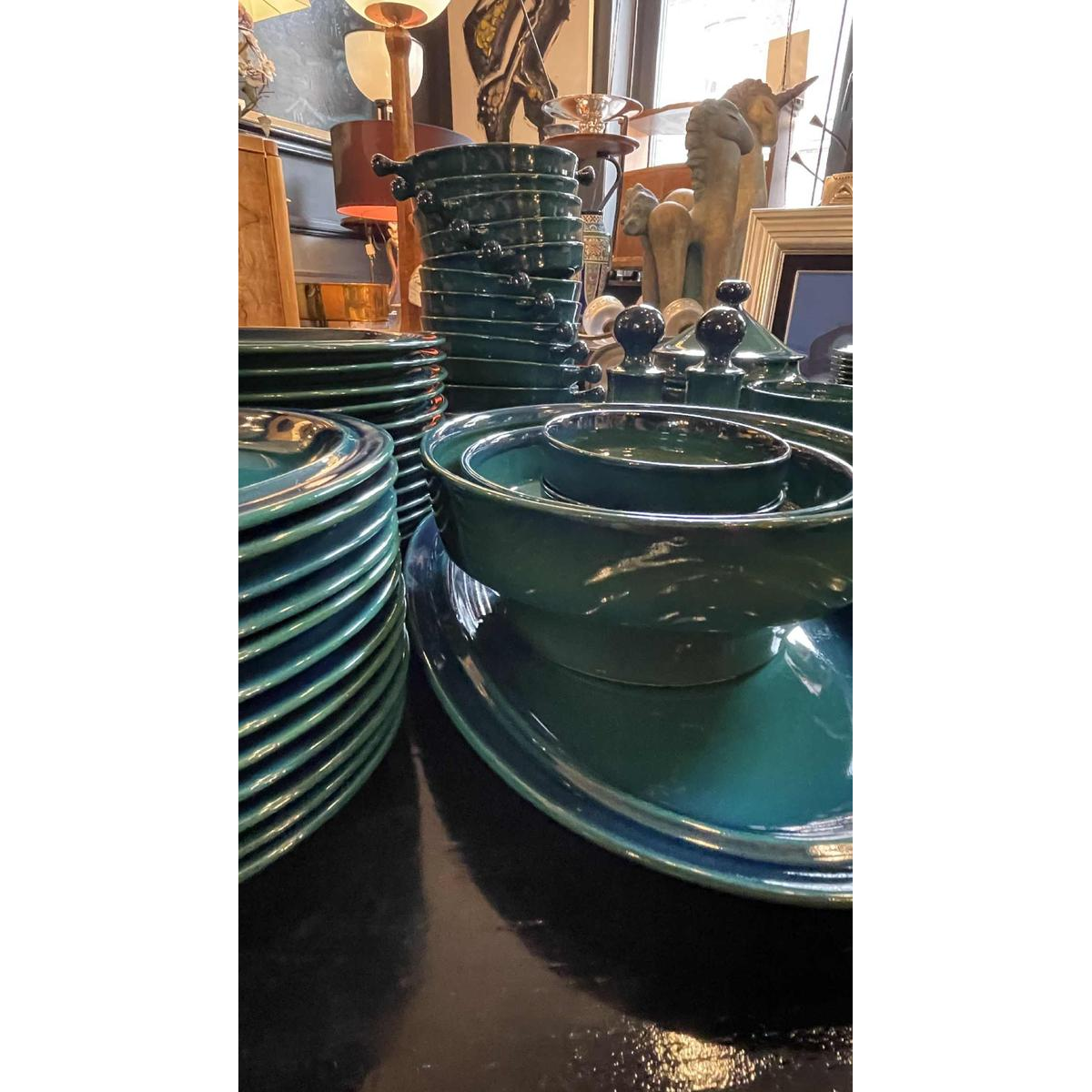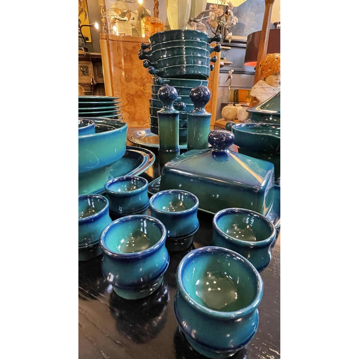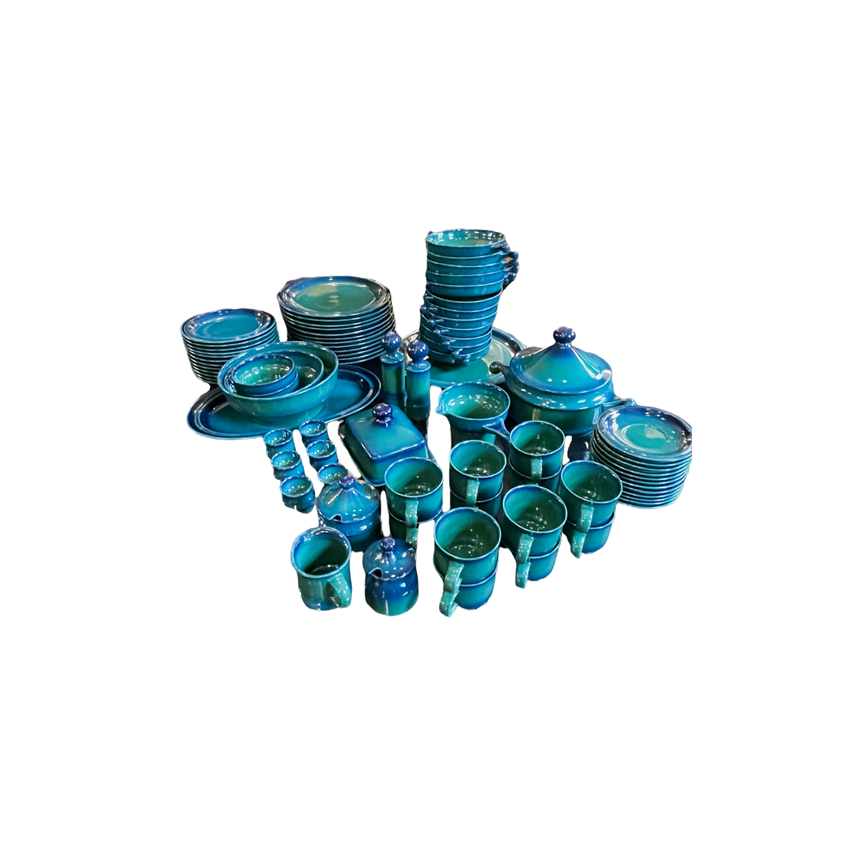 This complete set for 12 persons consists of 80 pieces and 4 lids, it has apparently never been used, the large dish still bears its label " Porzellan mit Keramischer Glasur ".