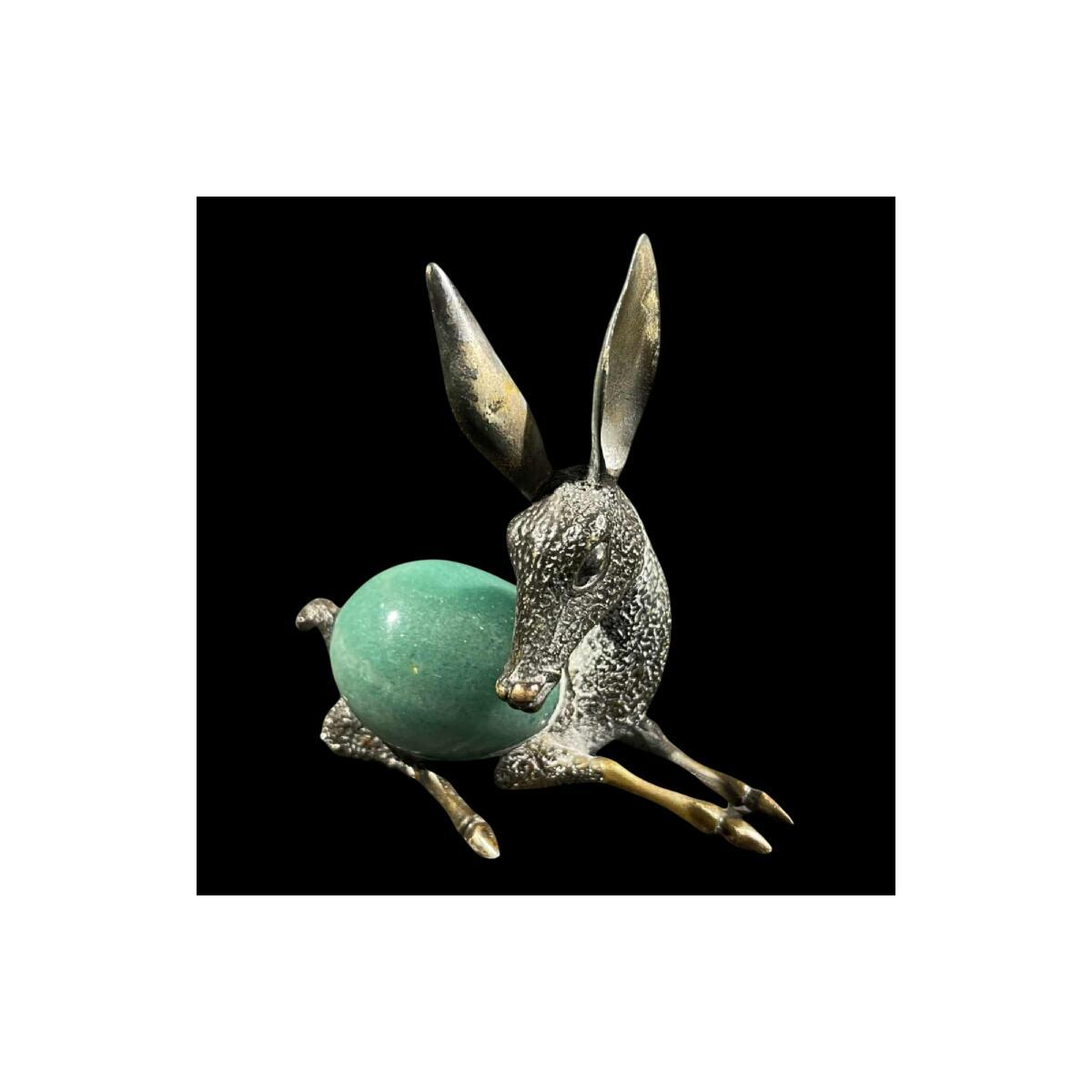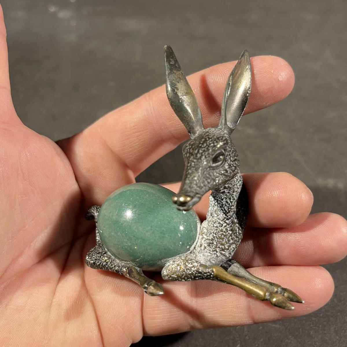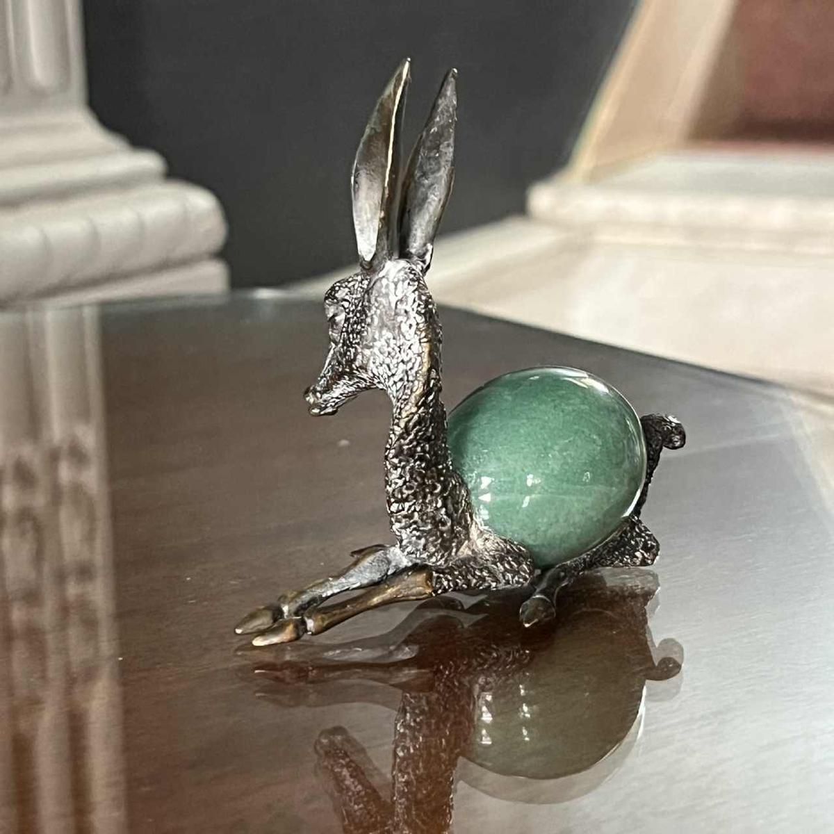 Animal sculpture of a fawn in silver-plated bronze and green quartz egg.