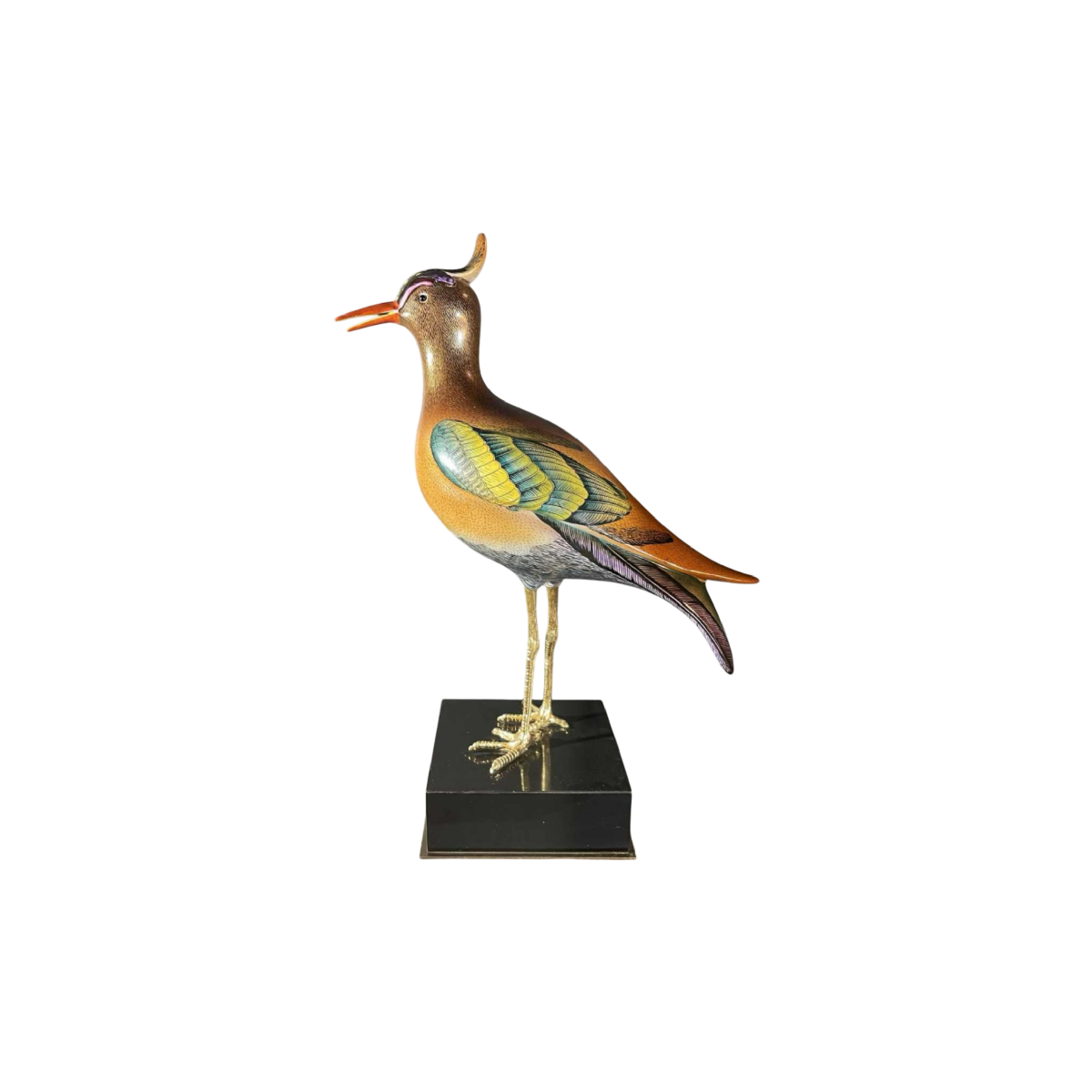 It represents a crested wading bird, probably a lapwing, meticulously colored. Its legs are in gilded bronze, and it rests on a square base in black melamine-coated wood, set on a brass base...