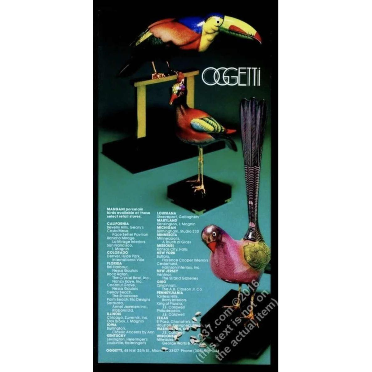 Guilia Mangani's works (notably toucan, marine fish, scorpion fish, fantastic birds,...), are recognized and sold in the world's leading decorating boutiques, notably in the USA under the 'Oggetti' banner.
