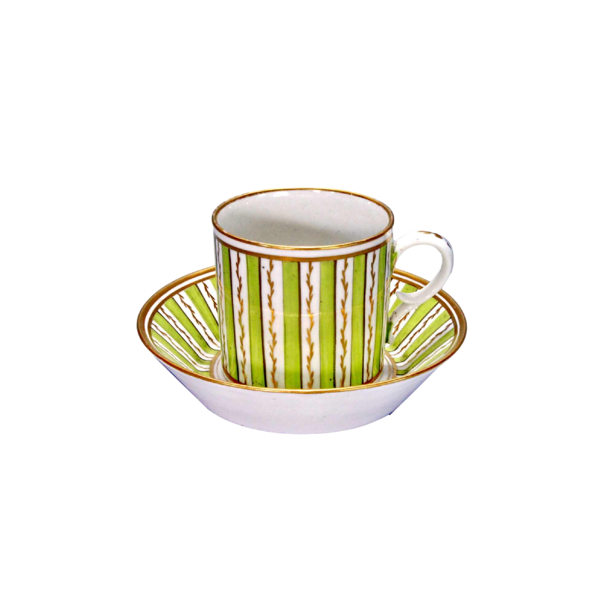 White background decorated in imitation of "TISSUS", with alternating green, white and gold bands, fillets and garlands of vertical foliage. Gold borders.