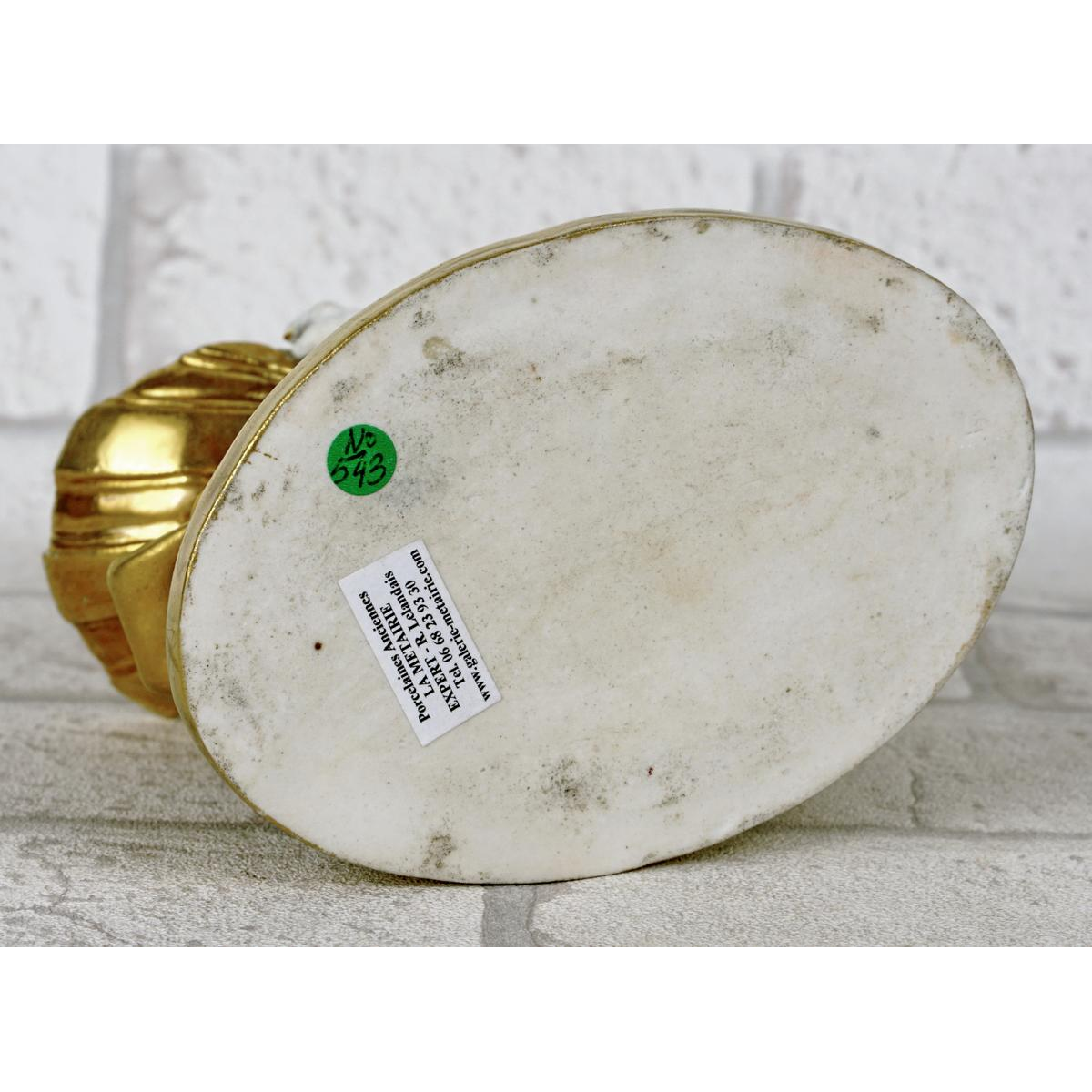 This neoclassical inkwell is inspired by the marine Thiasos (child of Venus / Cupid riding a dolphin), common in the decorative arts of the Empire years in Russia. The white & gold combination and the precise modeling of the dolphin refer to the high-end productions of the Gardner factory.
