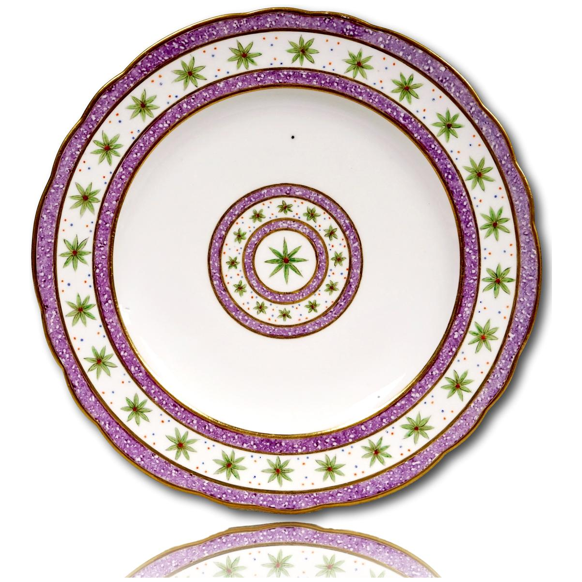This PLATE comes from the "ETRUSCAN PORPHYRY ROSETTE ZONES" SERVICE. A drawing of the decoration of this plate appears in the album of plate drawings kept at the Manufacture de Sèvres under no. 170. It was delivered to Citizen SAUVEGRAIN on 29 Ventôse Year VII (March 19, 1799), mentioned as a butcher or supplier to the hospice butchery or even supplier to public establishments. Ref.: D. Peters, Sèvres Plates and Service of the 18th century, 2005, no. 99-2, vol. V, pg 1205-1206.