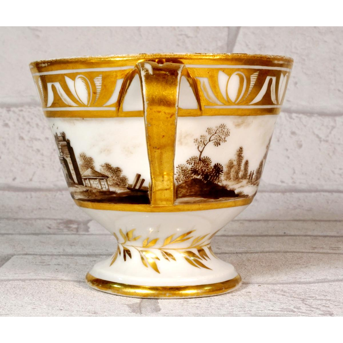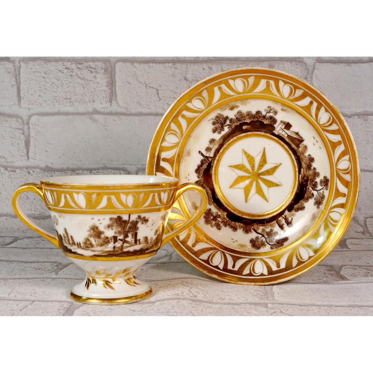White background with a rotating landscape decoration in sepia monochrome. Bordered by a band decorated with a geometric garland, and gold threads on the body and border. The saucer has the same decoration.