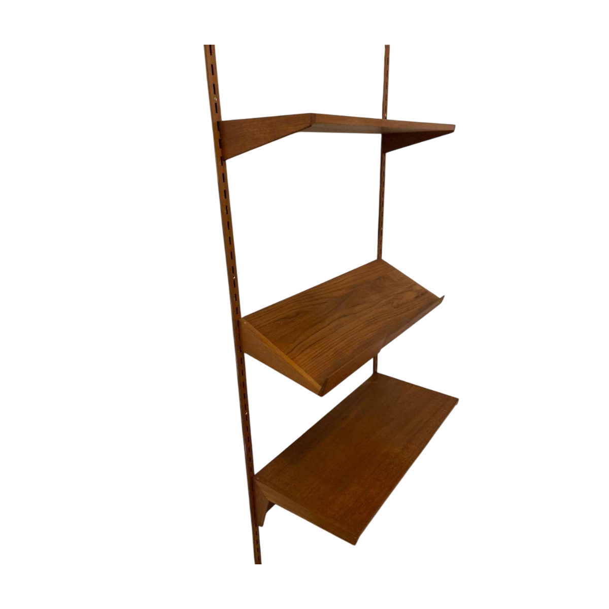 Three-tier modular teak wall-mounted bookcase. Featuring a modern Scandinavian design, conceived by the Danish cabinetmaker Kai Kristiansen in the 1960s.